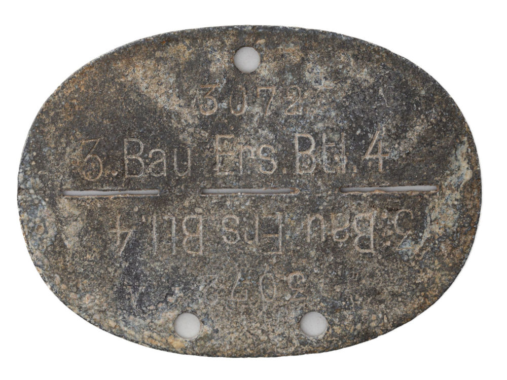Германия. Сплав металлов, штамповка. Надпись на жетоне: «3072 3. Bau Ers. Btl. 4». Размеры: 5х7 см. Состояние: в хорошей сохранности, следы бытования, следы коррозии металла.