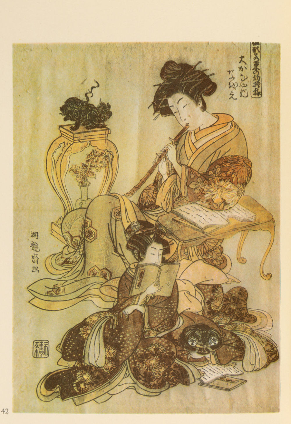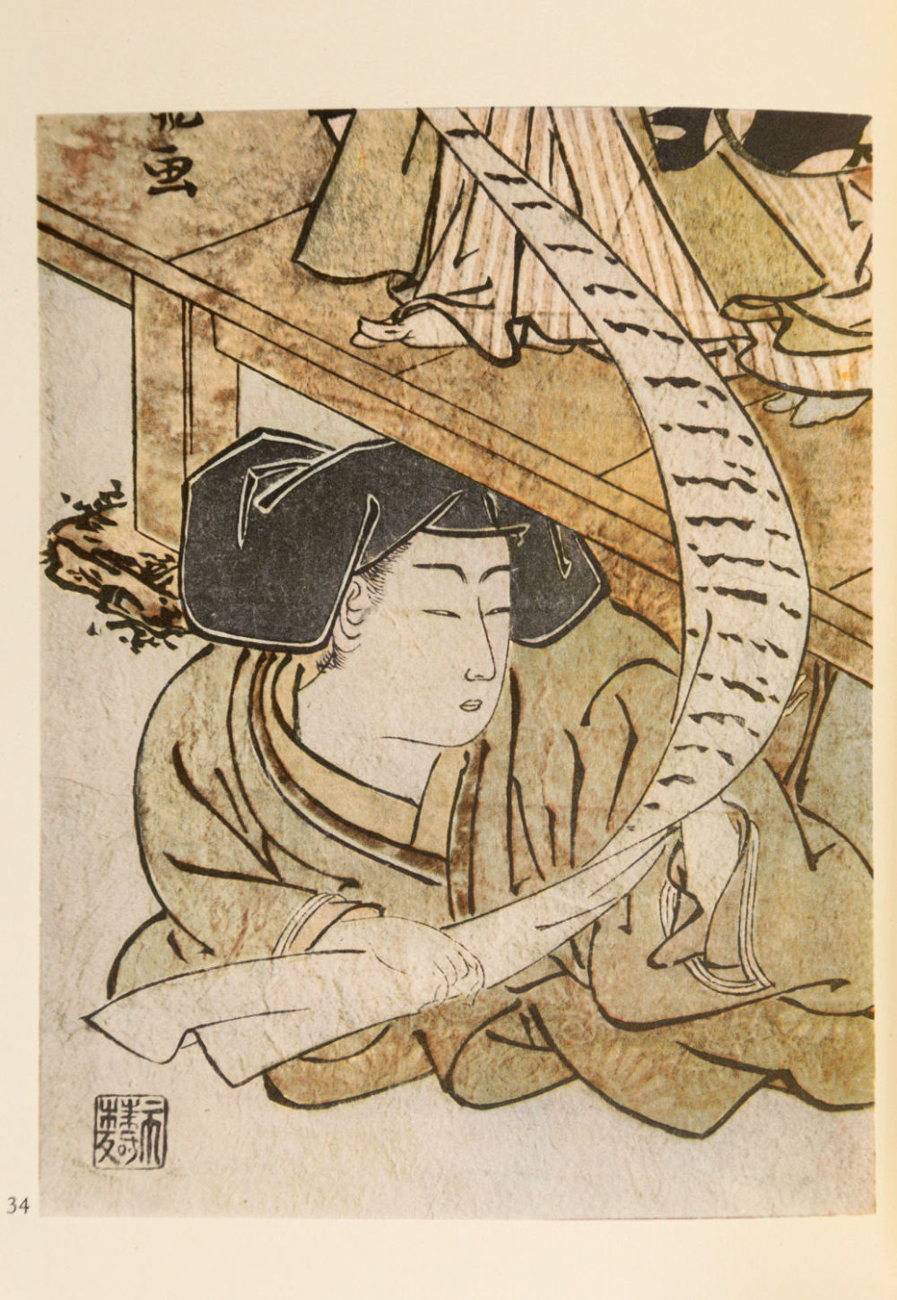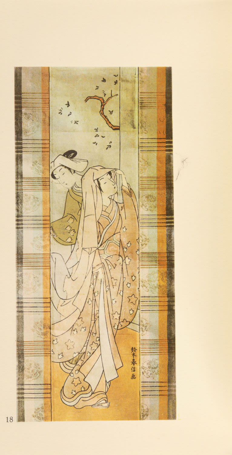 Основные героини Харунобу – хрупкие и грациозные куртизанки. Он также является автором множества «суримоно» (поздравительных благопожелательных гравюр) – они выпускались небольшим тиражом для узкого круга ценителей, и календарей («эгоёми»), пользовавшихся огромным успехом в 1765–1766 гг.