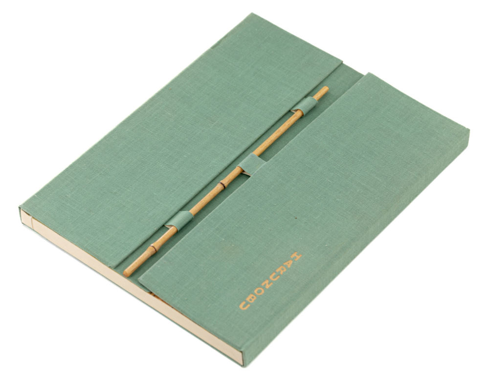 Цельнотканевый футляр с застежкой (бамбуковая палочка), золотое тиснение, сюжетные форзацы; блок прошит нитью.