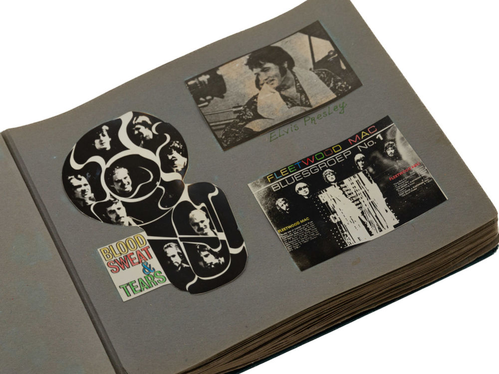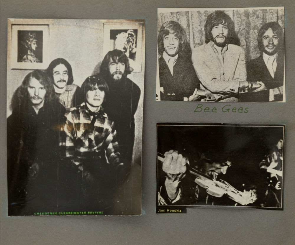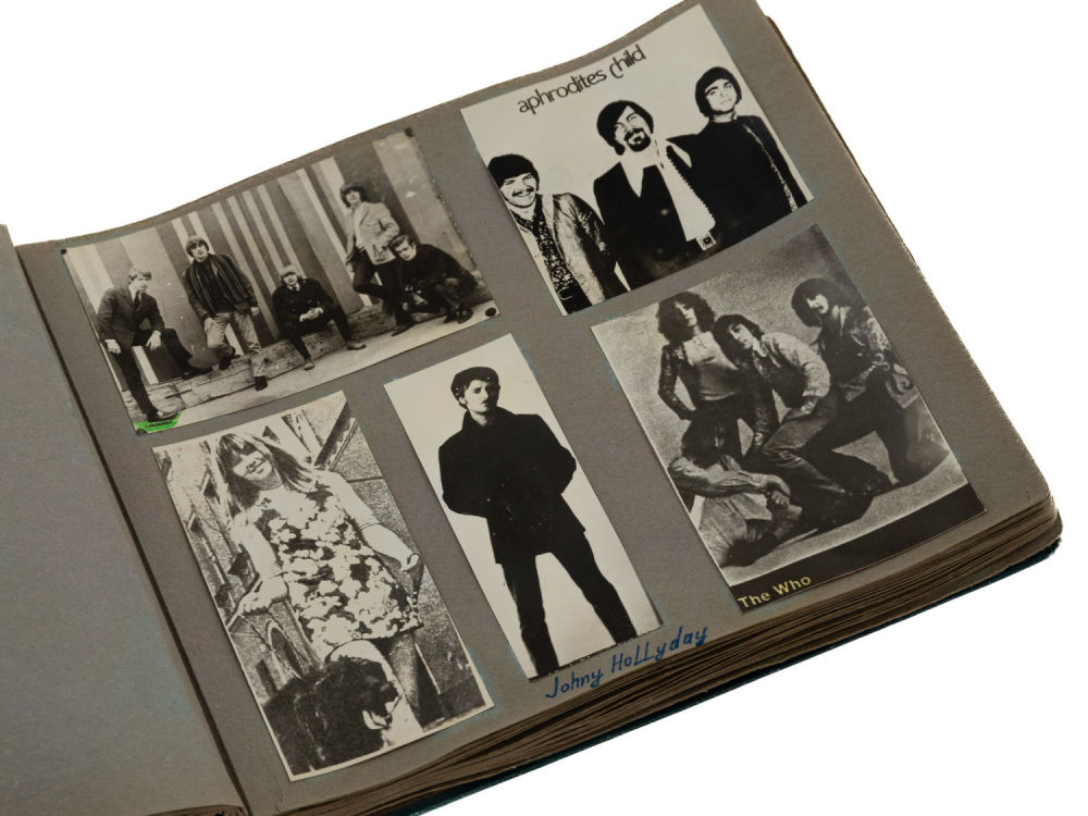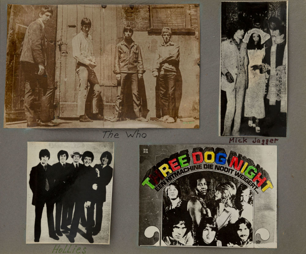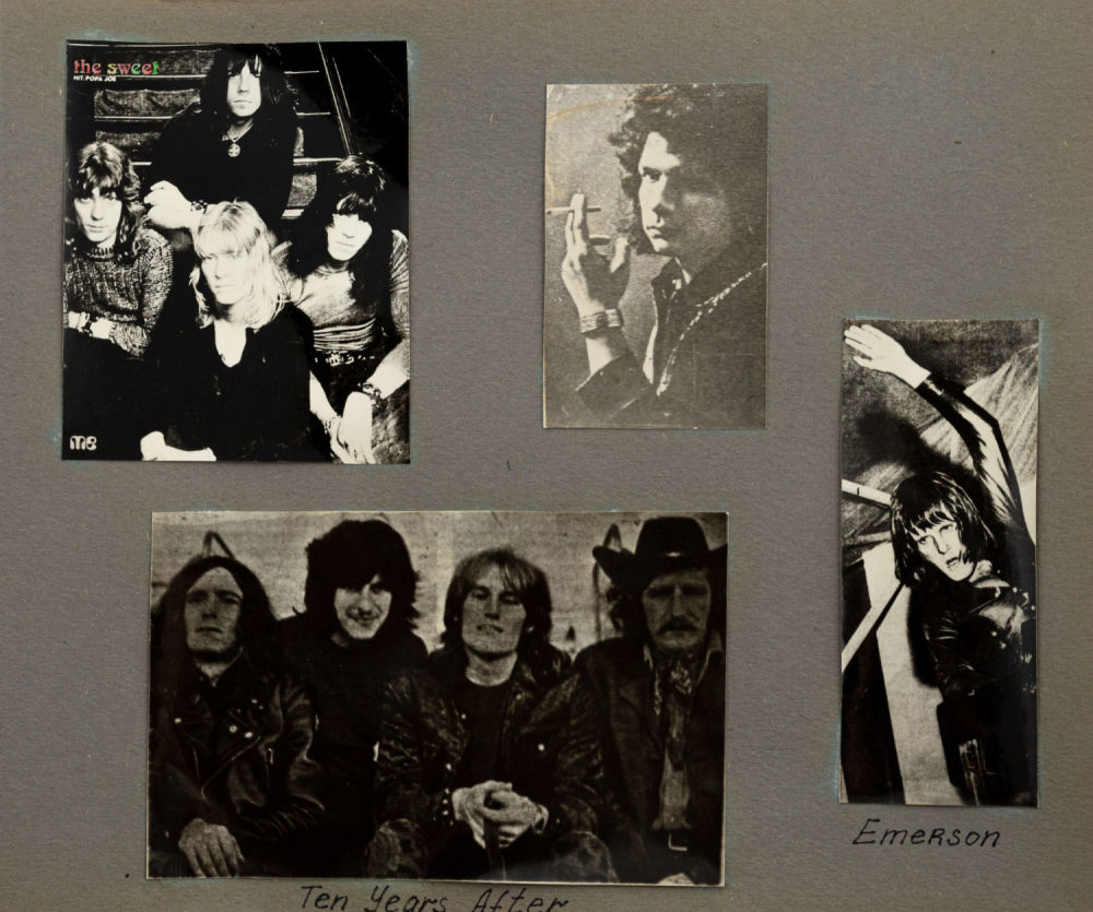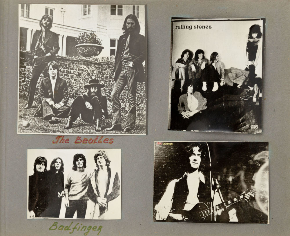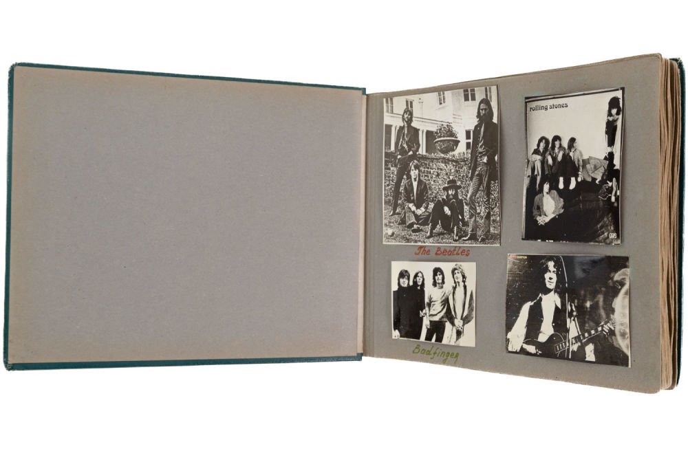 СССР. Бумага, картон, клей; ледерин, лента. Альбом содержит 121 фотографию музыкальных групп и исполнителей (Rolling Stones, The Who, Black Sabbath, Элвис Пресли и др.). Размеры: 23,7х32,6 см. Состояние: в хорошей сохранности, потертости и загрязнения обложки, потертости углов листов, выцветание листов по краям.