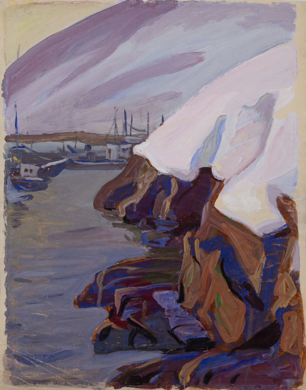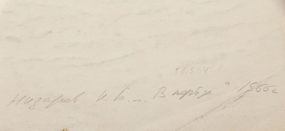 СССР. Бумага, темпера. В нижнем левом углу подпись художника карандашом: «Назаров К.Б. 1966». На оборотной стороне в нижнем левом углу надпись карандашом: «58,5х45,8 Назаров К.Б. «В порту» 1966 г.». В верхнем правом углу прямоугольная наклейка с надписью: «И21/345 1/3». Размеры: 58,5х45,8 см. Состояние: в хорошей сохранности, замятие нижнего левого угла, незначительные надрывы сторон и углов, незначительная утрата бумаги на верхней стороне, на оборотной стороне наклеены кусочки газетной бумаги.