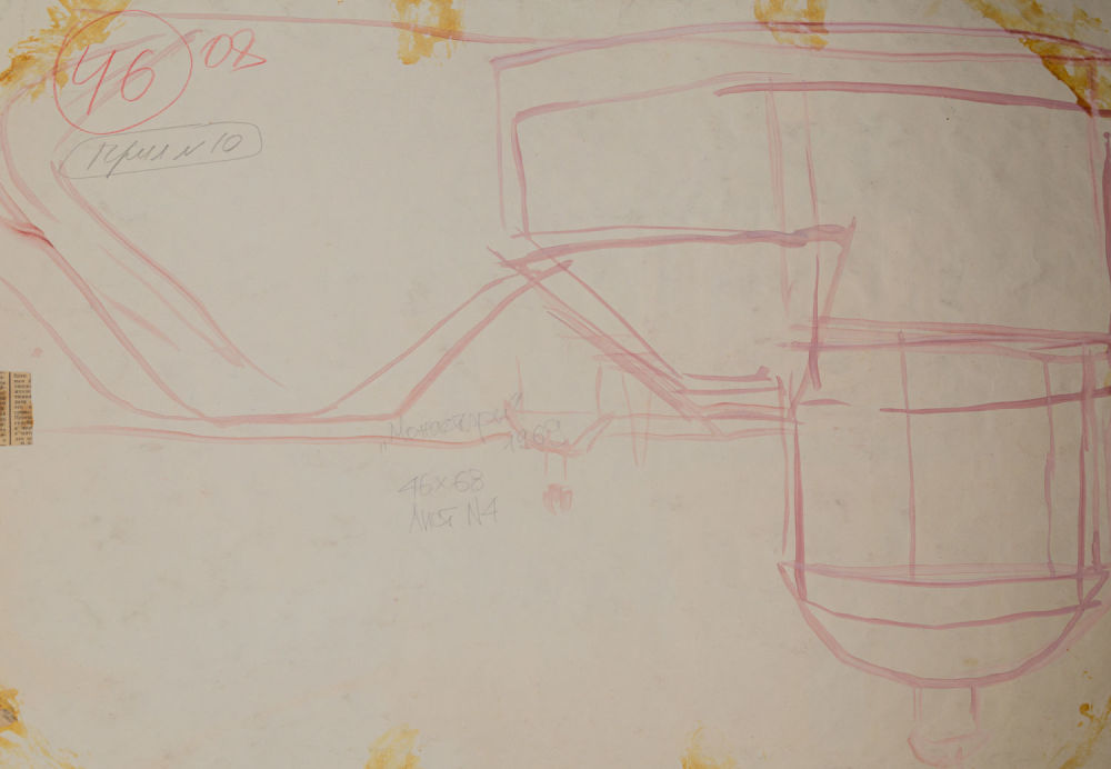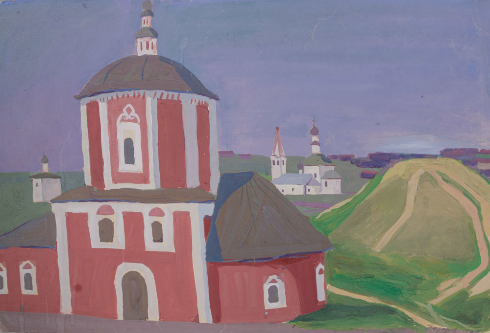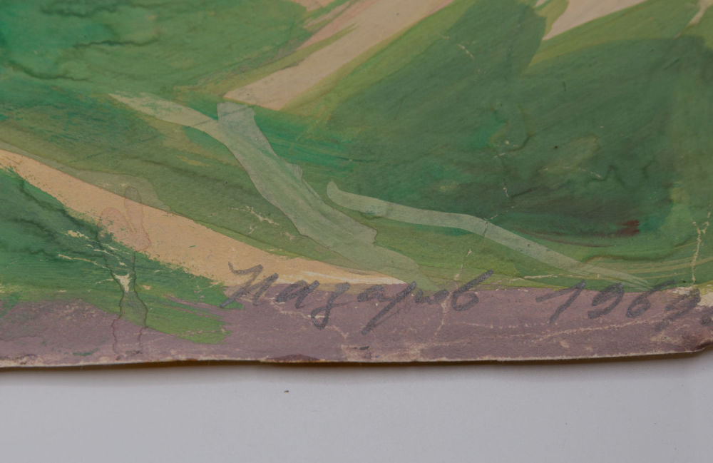 СССР. Бумага, гуашь. В нижнем правом углу подпись художника: «Назаров 1969 г.». На оборотной стороне эскиз и надписи: в верхнем правом углу «46 (в кругу) 08 Прил №10 (в овале)»; по центру карандашом «»Монастыри» 1969 46х68 Лист №4». Размеры: 46х68 см. Состояние: в хорошей сохранности, незначительные замятия углов с левой стороны, незначительные замятия листа, на нижней стороне слева – следы влаги, на оборотной стороне наклеены кусочки газетной бумаги.