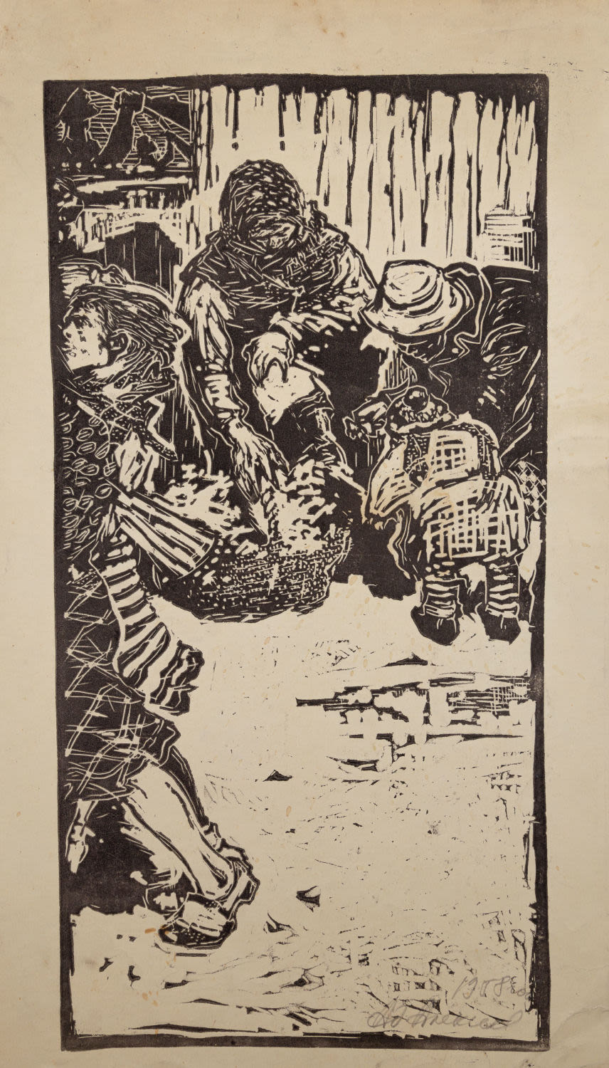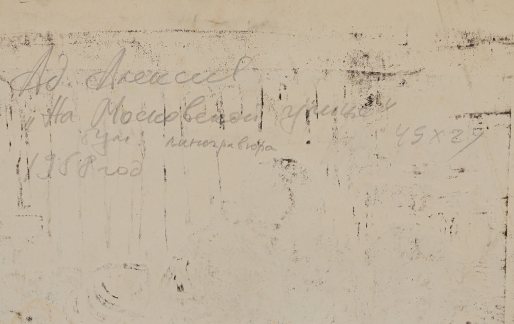 СССР, Москва. Бумага, линогравюра. В нижнем правом углу подпись художника карандашом: «1958 год Ад. Алексеев». На оборотной стороне в верхней части по центру надпись карандашом: «Ад. Алексеев "На Московской улице" 49х29 бум, линогравюра 1958 год». Размеры: 49х29 см. Состояние: в хорошей сохранности, незначительные заломы углов.