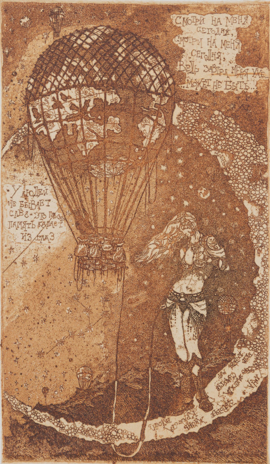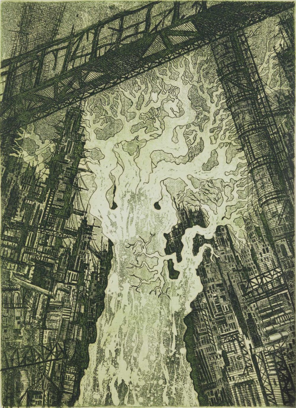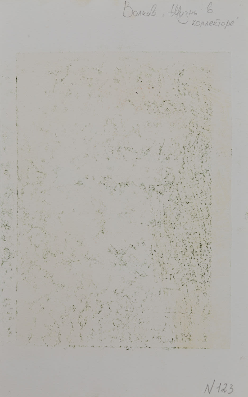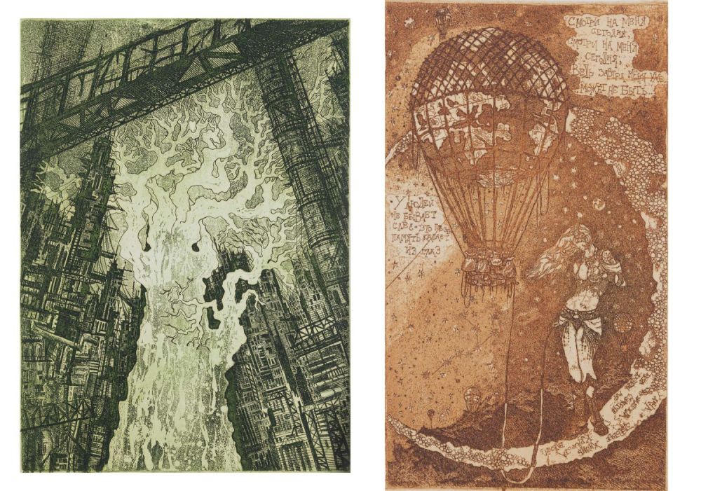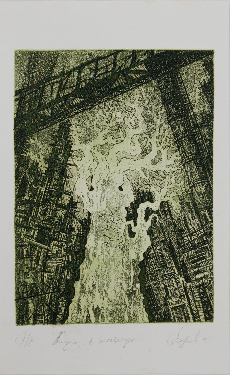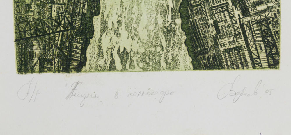 Россия. Бумага, офорт, акватинта (?). «Жизнь в коллекторе»: по нижнему краю подпись карандашом: «А/р «Жизнь в коллекторе»» и подпись автора: «Волков 05». На оборотной стороне надписи карандашом: «Волков «Жизнь в коллекторе»», «№123». Размеры: листа – 29,5х18,2 см, изображения – 21,6х15,7 см. Состояние: в хорошей сохранности.