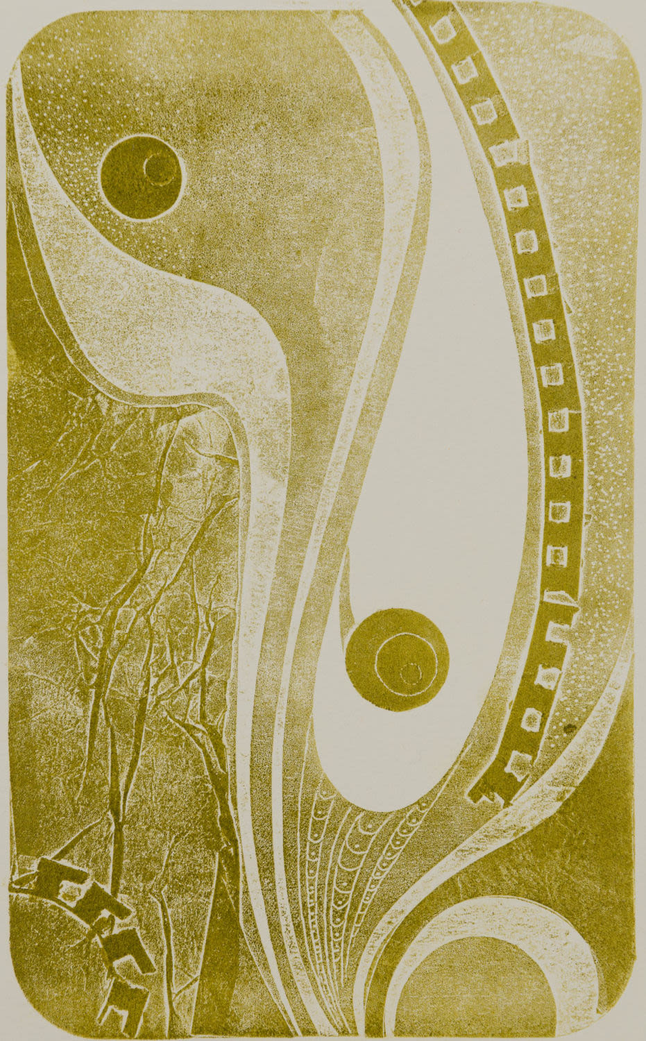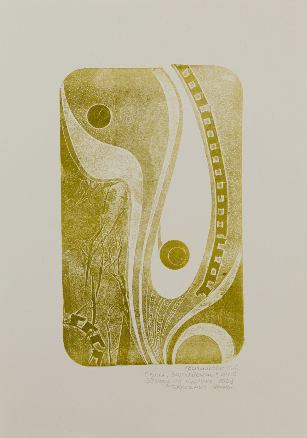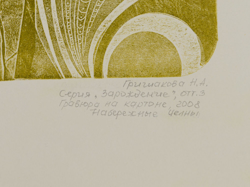 «Зарождение»: под гравюрой в правом нижнем углу подпись художницы карандашом: «Гришакова Н.А.» и надпись: «Серия «Зарождение», отт. 3 Гравюра на картоне, 2008 Набережные Челны». На оборотной стороне надписи: «Гришакова «Зарождение»», «№208». Размеры: листа – 29,7х20,7 см, изображения – 19,6х12 см. Состояние: в хорошей сохранности, незначительный надрыв на верхней стороне слева.