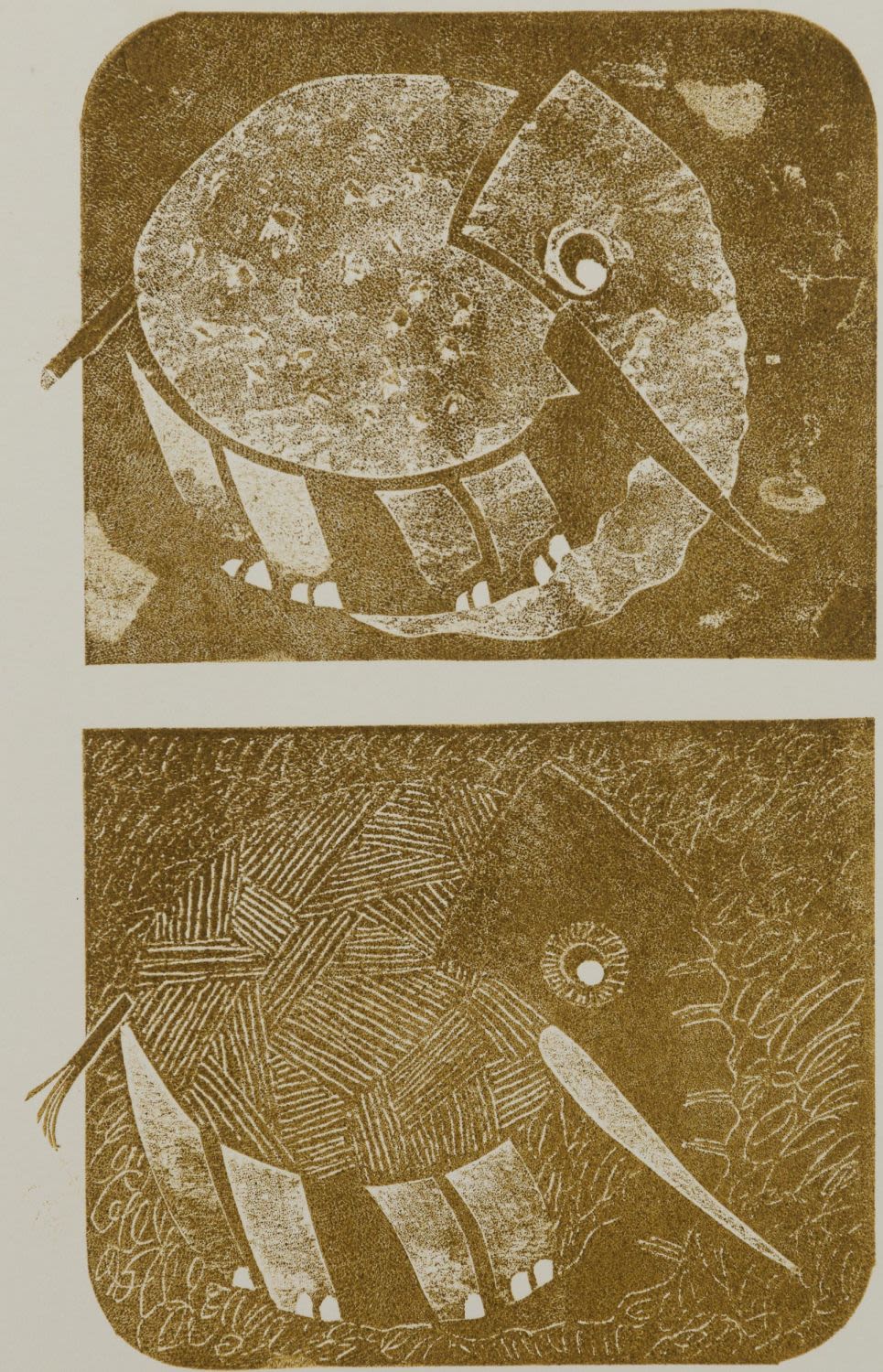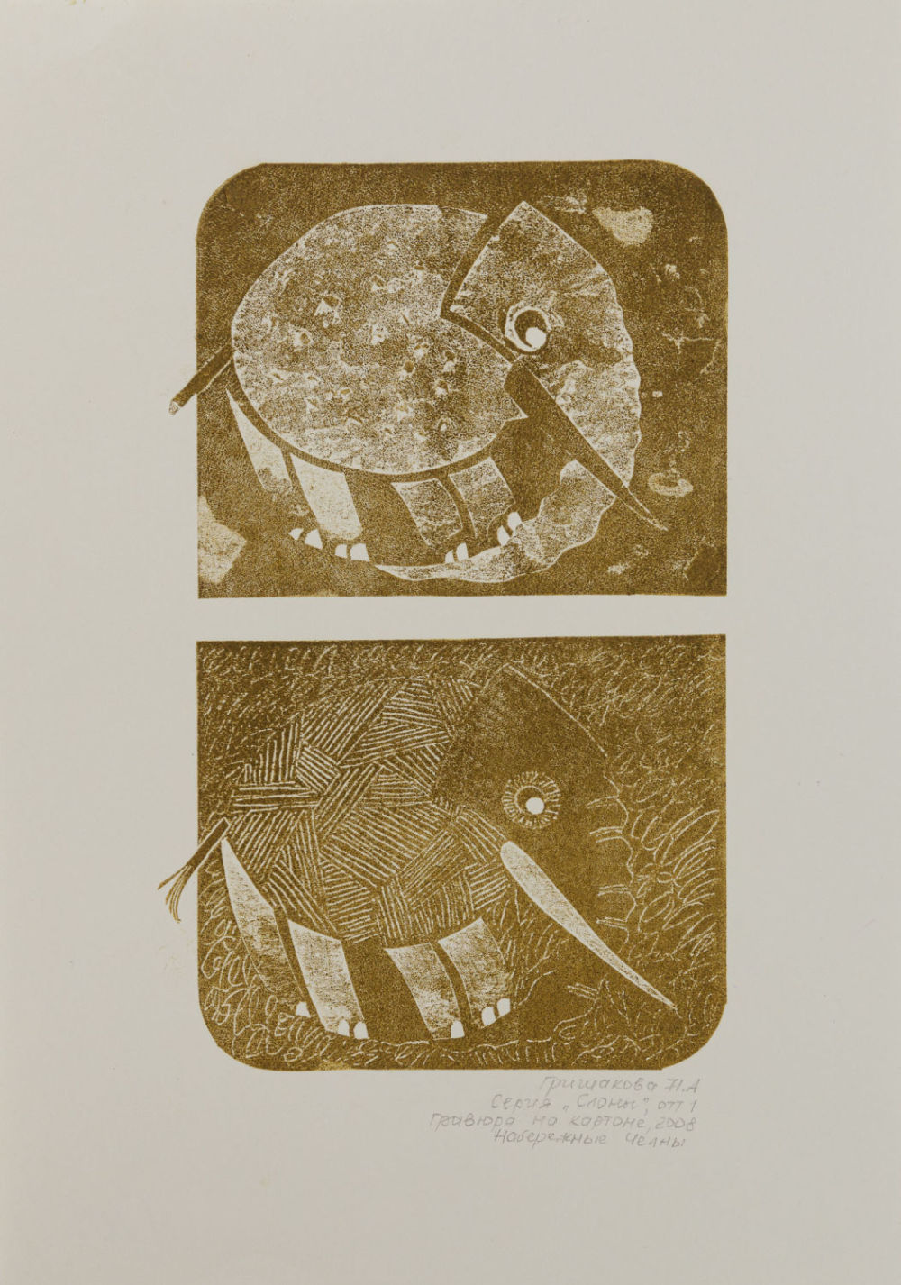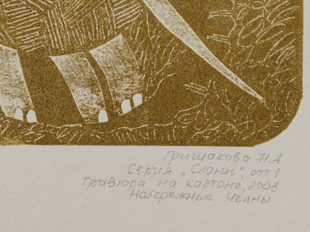 Россия, Набережные Челны. Бумага, гравюра на картоне. «Слоны»: под гравюрой в правом нижнем углу подпись художницы карандашом: «Гришакова Н.А.» и надпись: «Серия «Слоны», отт 1 Гравюра на картоне, 2008 Набережные Челны». На оборотной стороны надпись карандашом: «№207». Размеры: листа – 29,7х20,7 см; изображения – 20,5х12,6 см. Состояние: в хорошей сохранности.