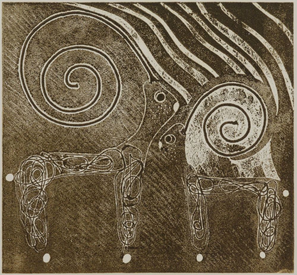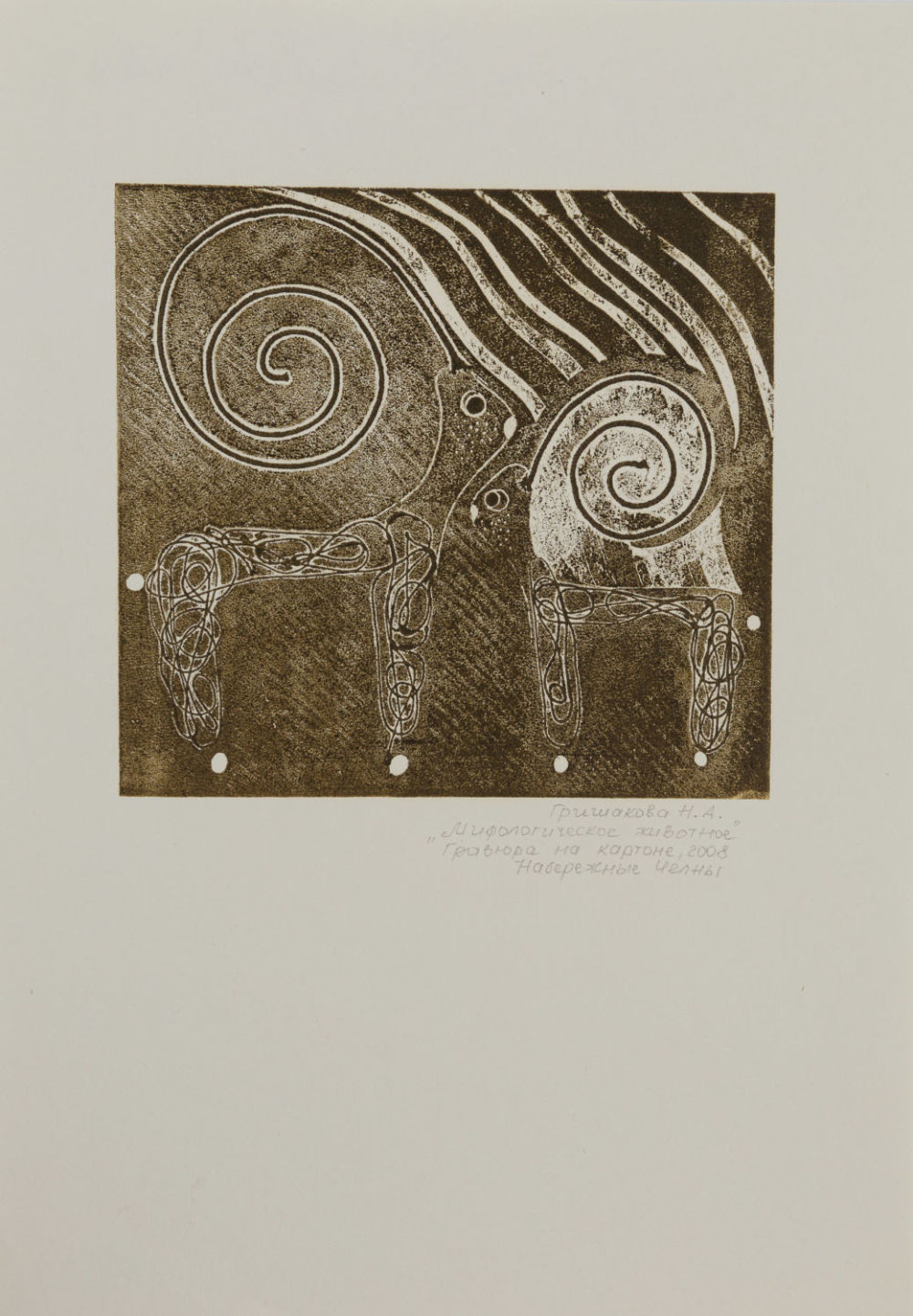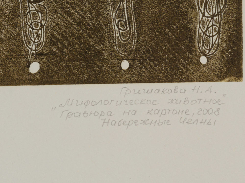 «Мифологическое животное»: под гравюрой в правом нижнем углу подпись художницы карандашом: «Гришакова Н.А.» и надпись: «»Мифологическое животное» Гравюра на картоне, 2008 Набережные Челны». На оборотной стороне надписи: «Гришакова «Мифологю жив-е»», «№209». Размеры: листа – 29,7х20,7 см, изображения – 13,5х14,5 см. Состояние: в хорошей сохранности.