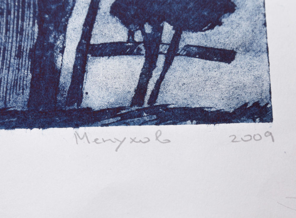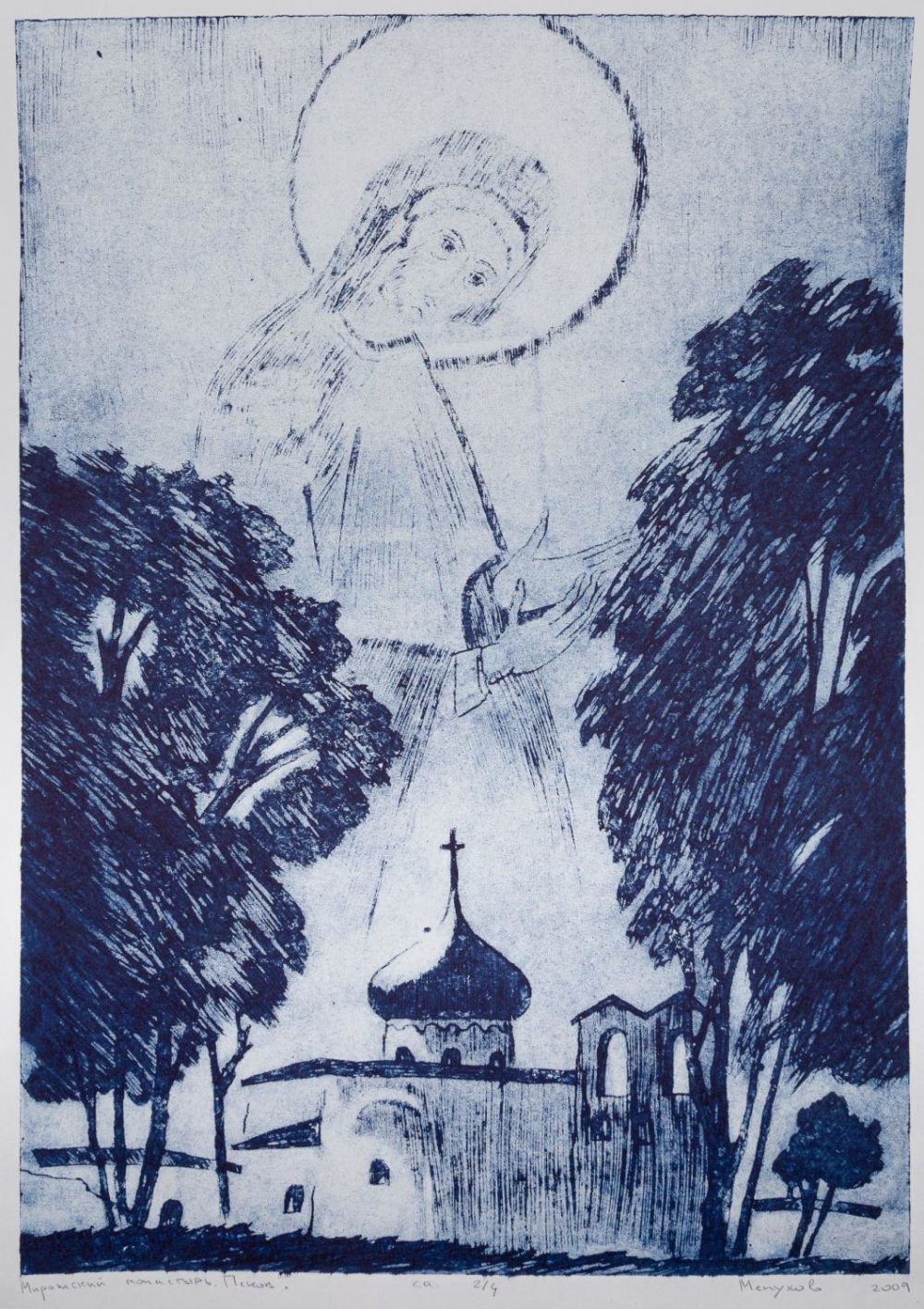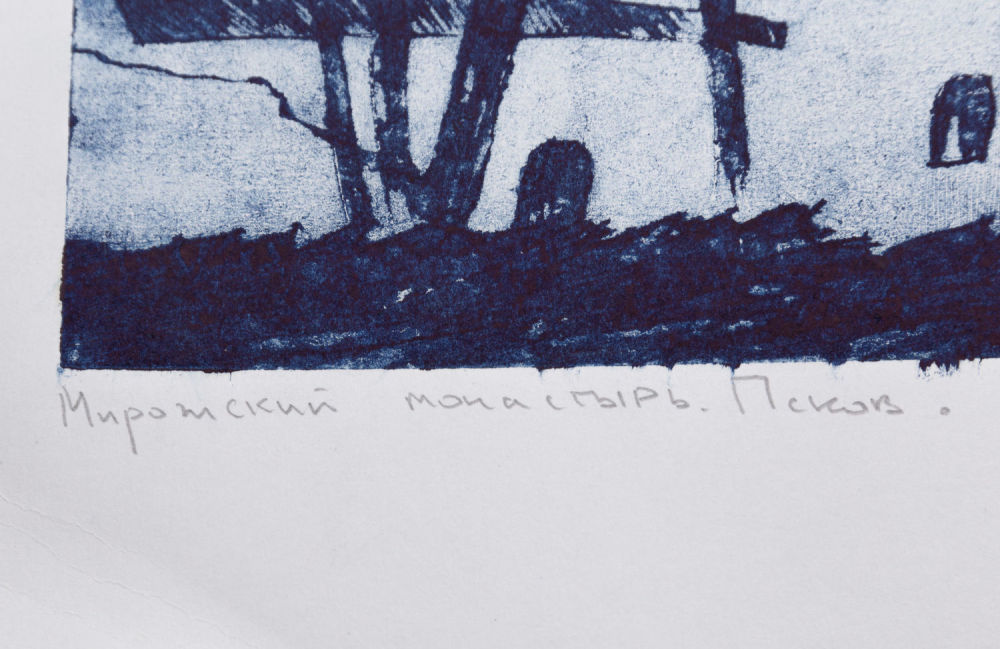 Россия. Бумага, гравюра на картоне. Под изображением надписи карандашом: «Мирожский монастырь. Псков», «са 2/4», «Менухов 2009». На оборотной стороне надпись карандащом: «Менухов Александр 1981 г.р. г. Северодвинск «Мирожский монастырь. Псков» гравюра на картоне 59х42 2009 г.». Размеры: лист – 66,4х48 см; изображение – 59х42 см. Состояние: в хорошей сохранности, заломы и замятия углов.