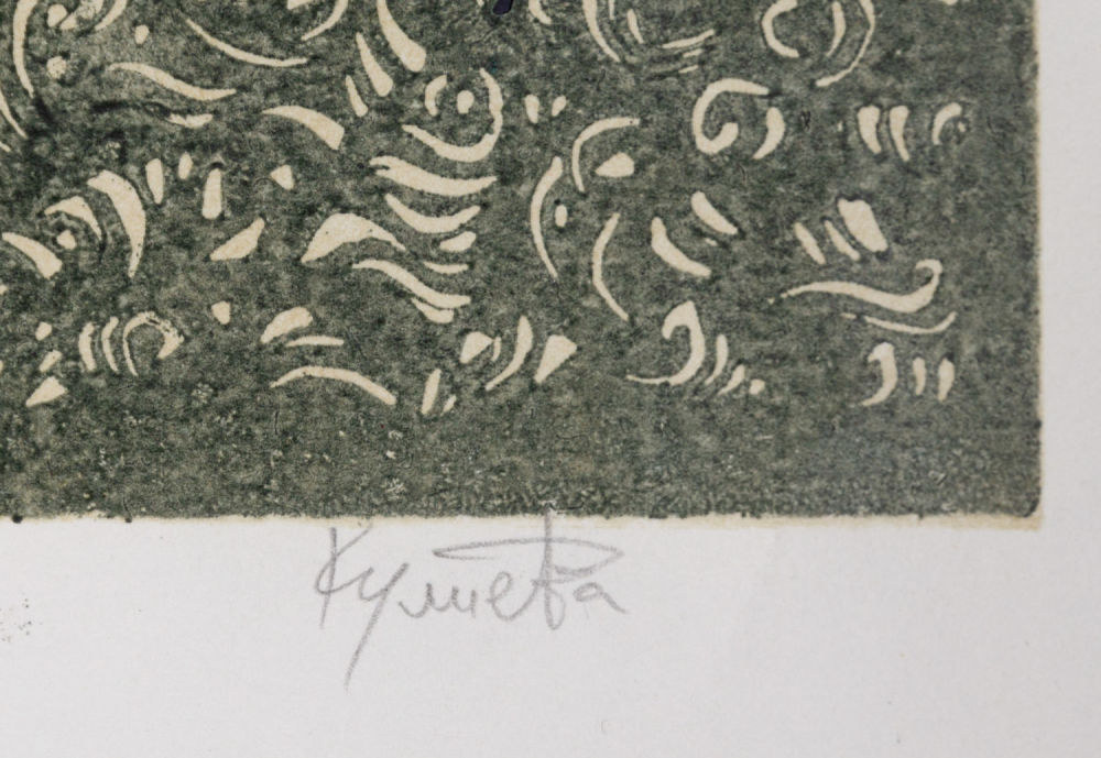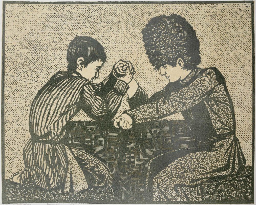 Россия. Бумага, литография. Под изображением надпись карандашом: «6/10 цв. линогравюра «Армрестлинг» З. Кулиева 2007 год». В нижнем правом углу подпись художницы: «Кулиева». На оборотной стороне в нижнем правом углу надпись карандашом: «№237». Размеры: листа – 47,3х56,6 см; изображения – 40,7х50,7 см. Состояние: в хорошей сохранности, незначительнные замятия углов листа, незначительные загрязнения на оборотной стороне.