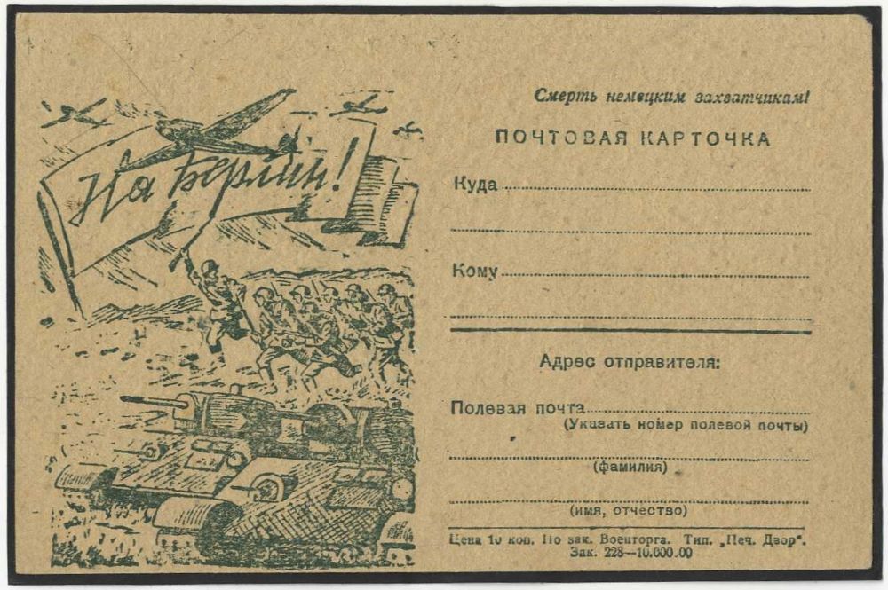 В отличие от других видов печатной продукции, выпуск которых в годы Великой Отечественной войны резко упал, издание открыток в 1941-1943 годах почти не отставало от довоенного уровня, так как фронту и тылу постоянно требовалась оперативная пропаганда. Миллионными тиражами выпускались патриотические открытки, призывающие к борьбе с врагом: «Вперёд, на Запад!», «Все силы народа — на разгром врага», «Всё для фронта, всё для победы».