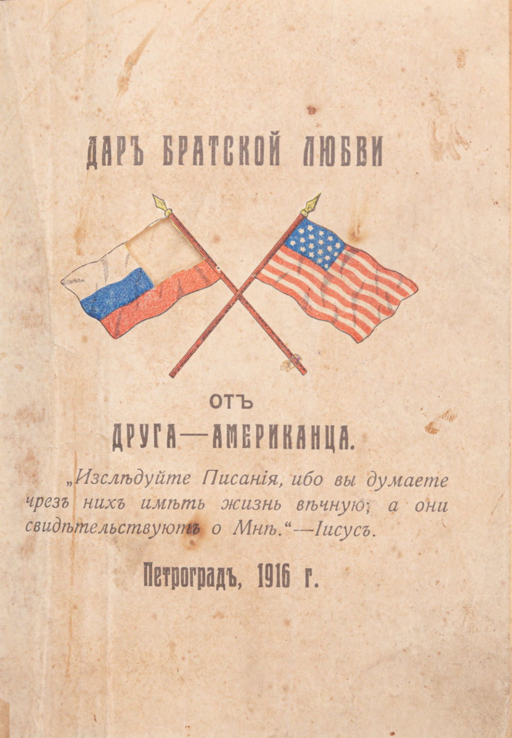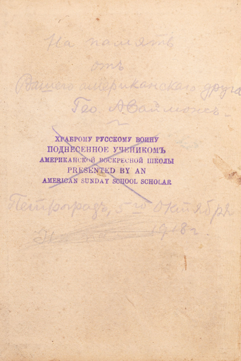 Штамп на форзаце: «Храброму русскому воину поднесенное учеником американской воскресной школы».