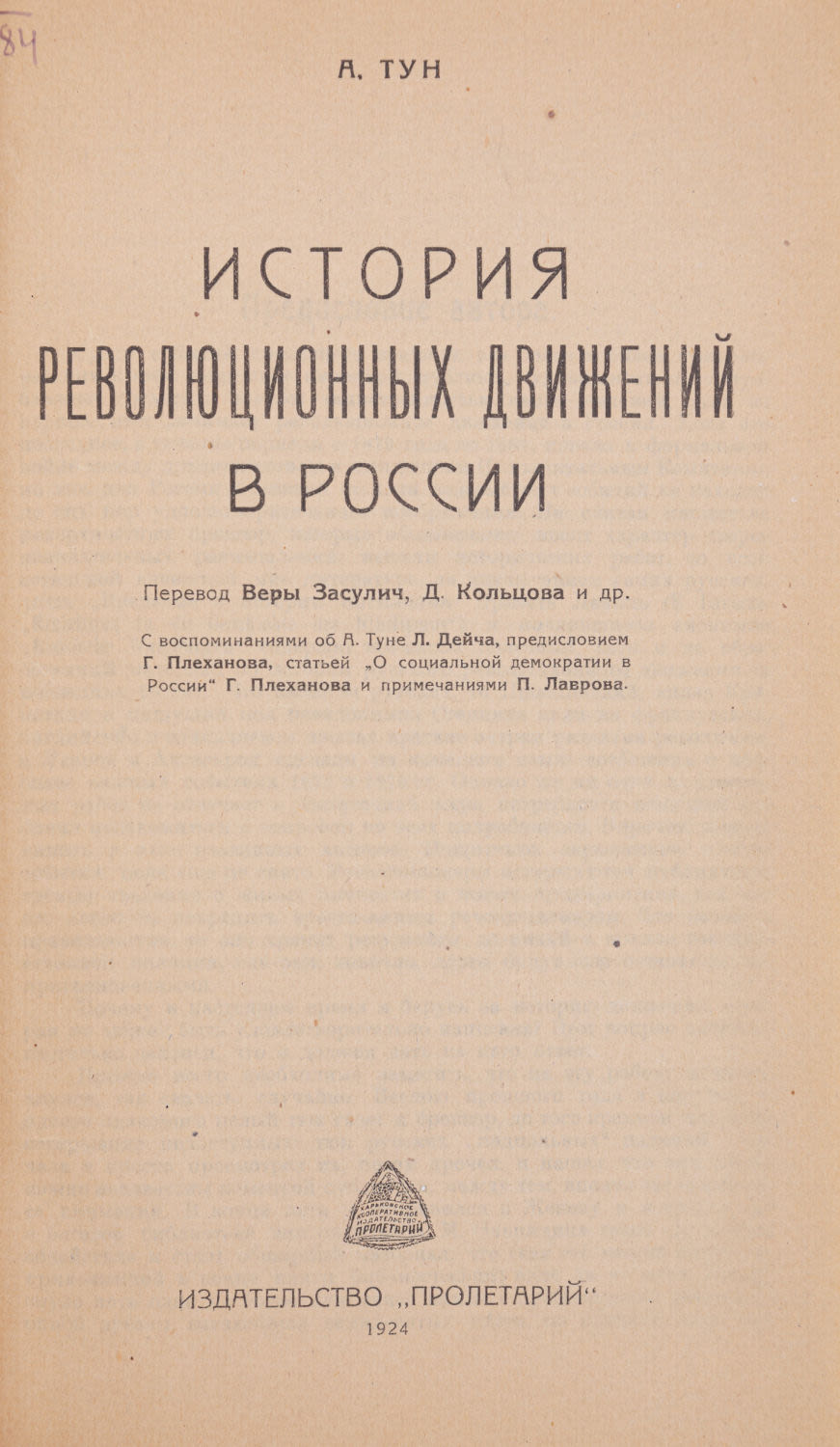 Пер. Веры Засулич, Д.Кольцова и др. С воспоминаниями об А.Туне Л.Дейча, предисл. Г.Плеханова, ст.: «О социальной демократии в России» Г.Плеханова и примеч. П.Лаврова. [Харьков]: Пролетарий, 1924. – 178, [3] с.; 25,5×17 см.