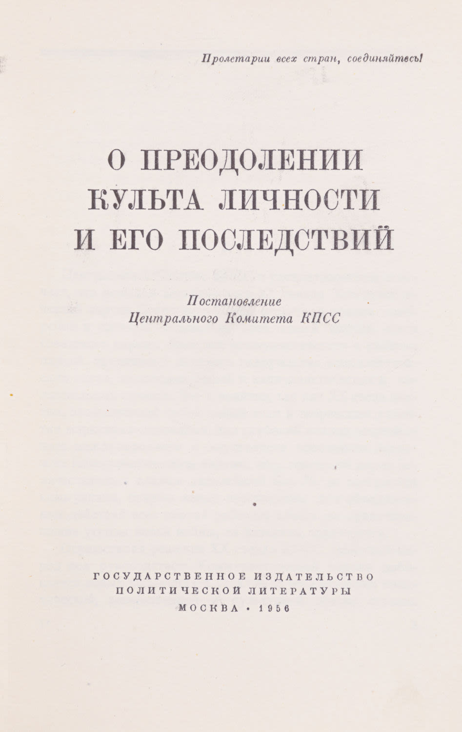 1) О преодолении культа личности и его последствий: Постановление ЦК КПСС. [30/VI 1956 г.]. М.: Госполитиздат, 1956. – 32 с.; 20×13 см.
