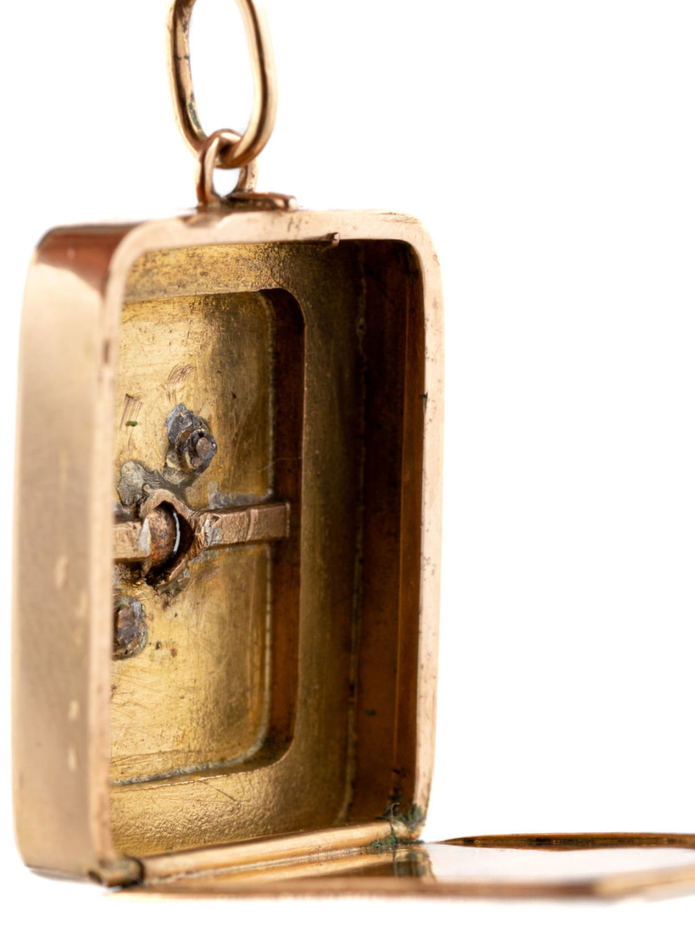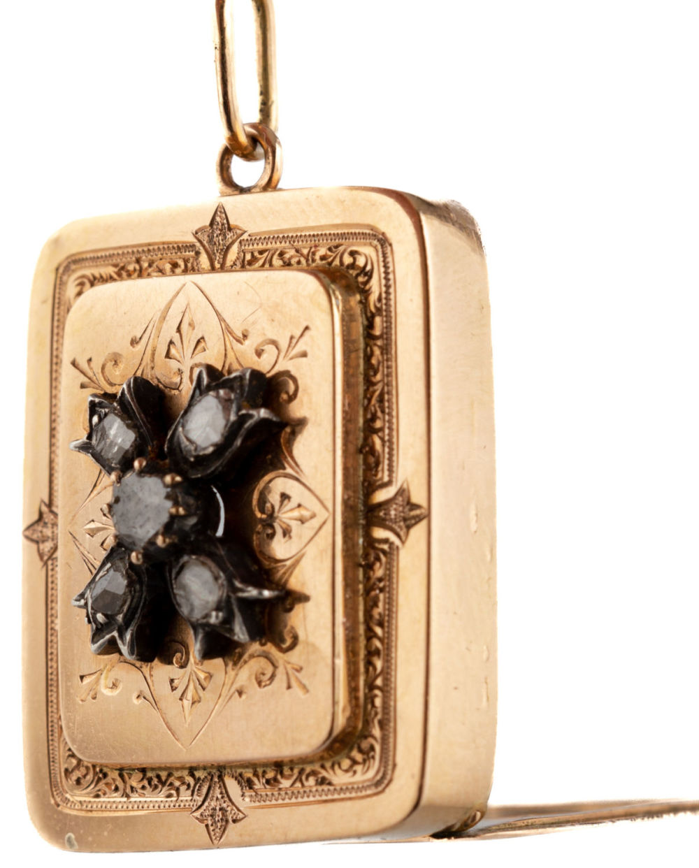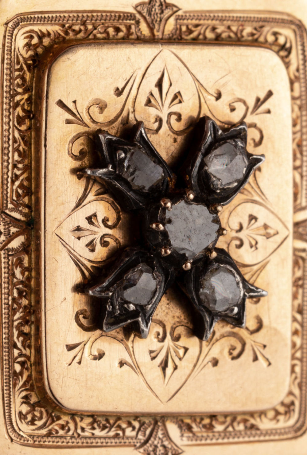 Россия (?). Золото, сплав металлов, полировка, гравировка, монтировка; 5 алмазов на крышке. Размеры: 22х12х4 мм. Общий вес: 5,7 г. Состояние: в хорошей сохранности; клейма отсутствуют. Металлы и камни определены при помощи детектора драгметаллов DMe-03 производства КБСП и детектора камней Gem Tester II производства Presidium.