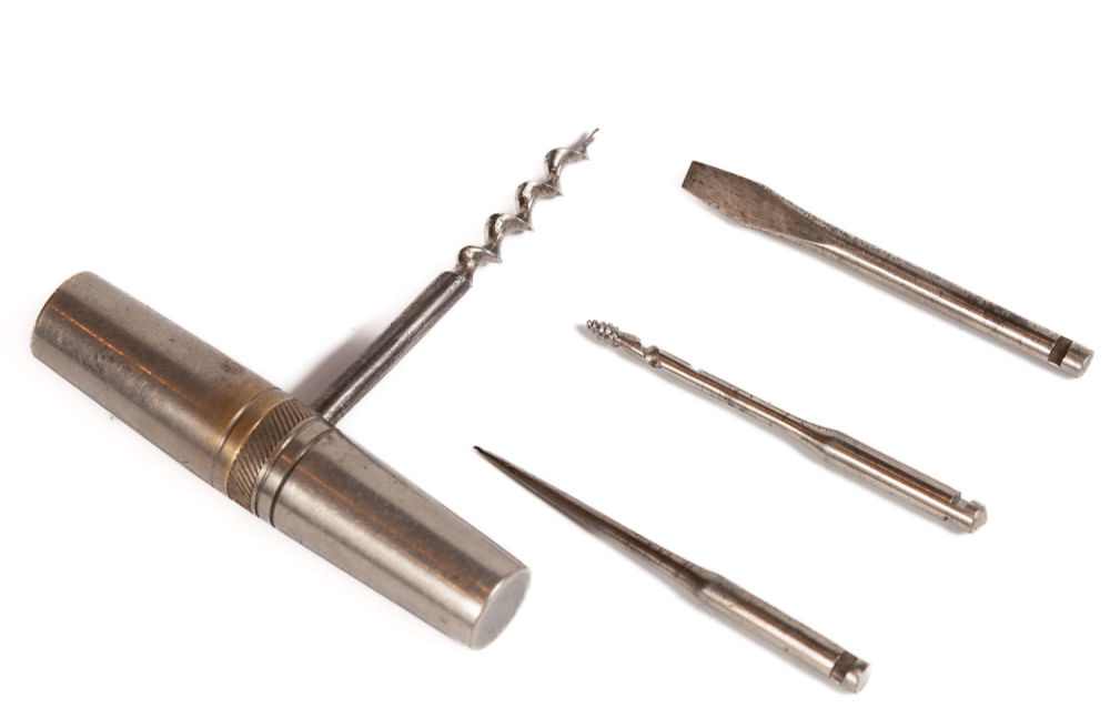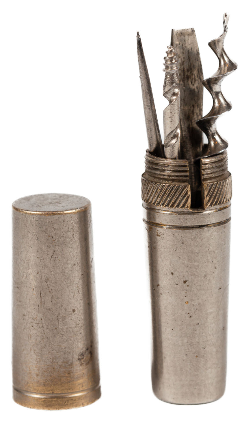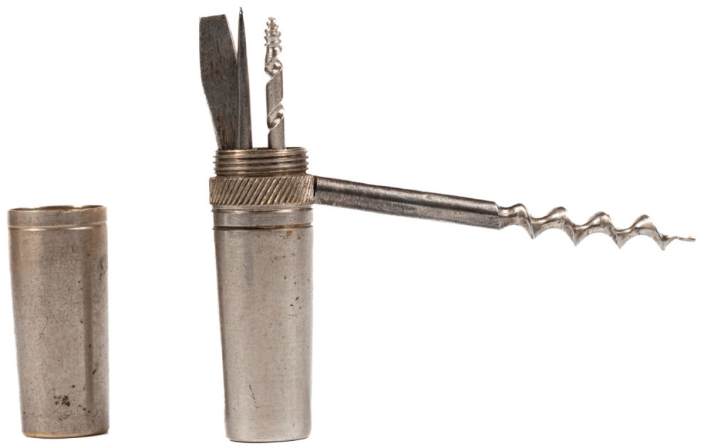 Европа, Германия (для Российском империи). В набор входят: шило, штопор, отвертка, сверло. Футляр служит рукояткой. Сплав металлов, фабричное производство. Размеры: длина футляра – 8 см; штопора – 7 см; шила – 6,8 см; отвертки – 6,7 см; сверла – 6,6 см. Состояние: в хорошей сохранности, незначительные следы потемнения металла и следы бытования.
