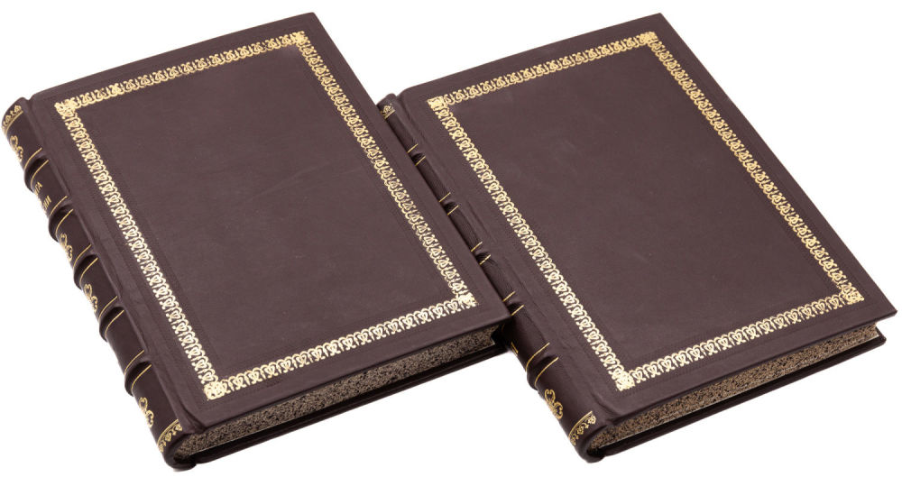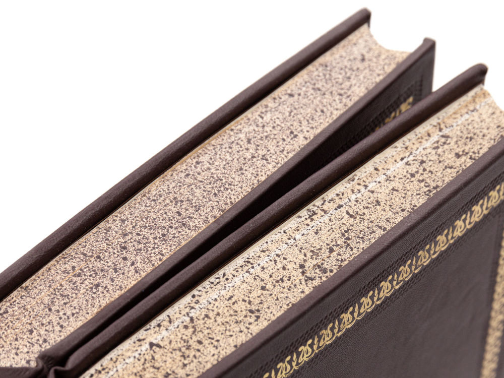 Переплет – владельческий; картон, корешки – кожа с золотым тиснением, разделены бинтами на шесть сегментов, трехсторонние крапчатые обрезы.