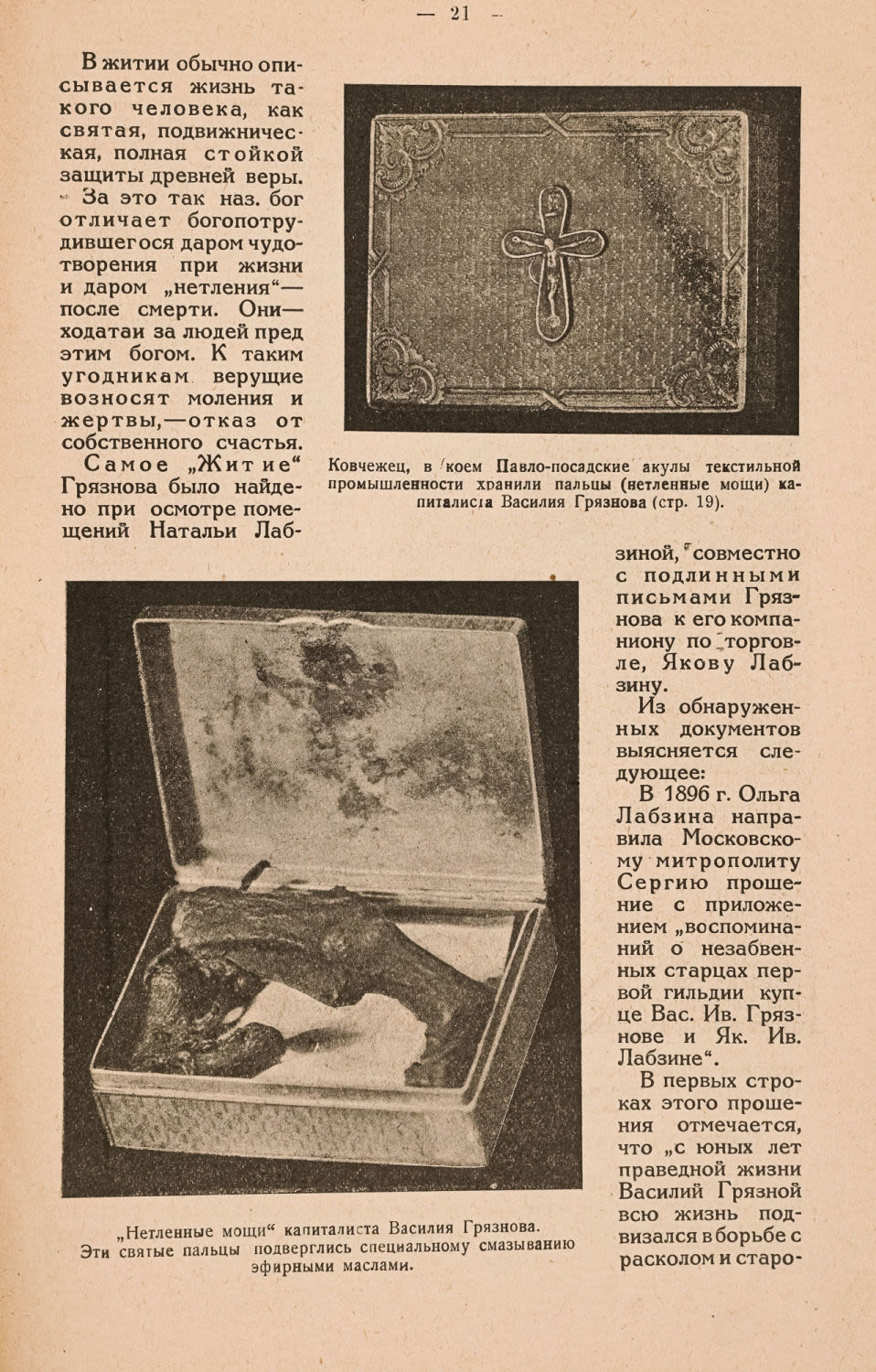 Издание посвящено описанию использования культа святого Василия Ивановича Грязнова (1816–1869) фабрикантами-текстильщиками дореволюционной России для удержания рабочих в повиновении.
