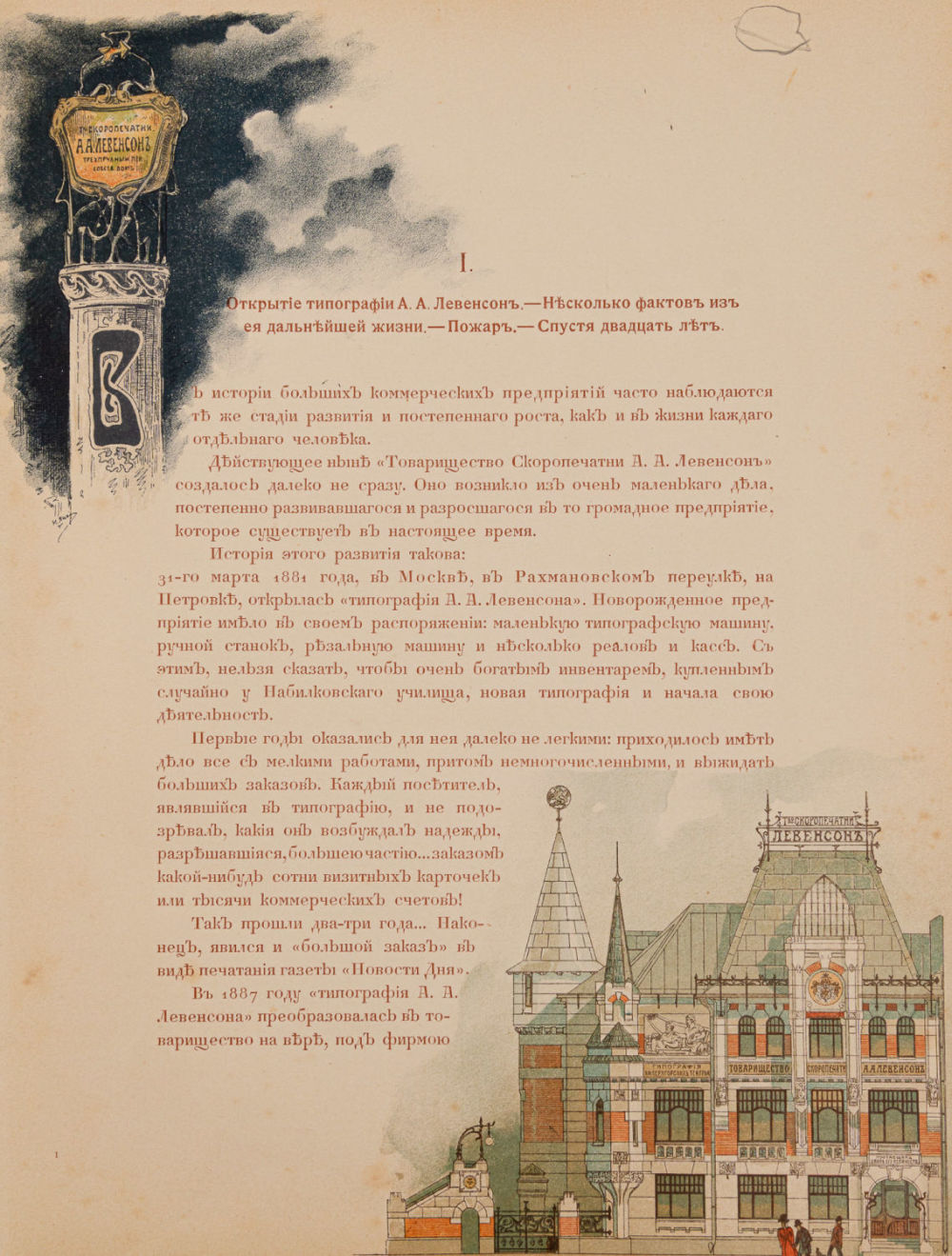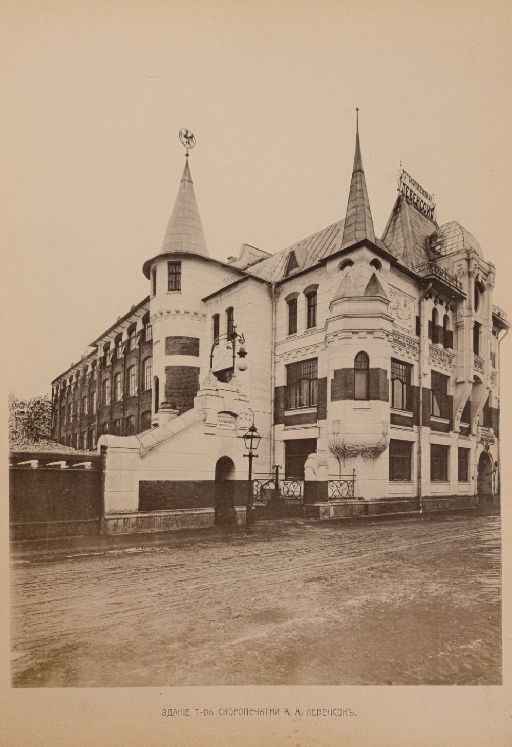 Из предисловия: «Предпринимая настоящее издание, Товарищество Скоропечатни А.А. Левенсон задалось целью не только представить в иллюстрированном описании вновь сооруженное здание своей типо-литографии, но и познакомить попутно своих уважаемых клиентов со всеми процессами, совершающихся в ее мастерских».