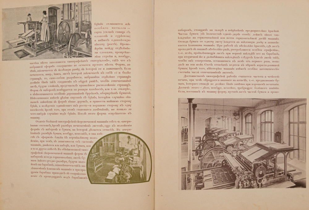 Книга описывает весь комплекс типолитографских процессов, с устройством новейших машин и трудом рабочих в каждой из мастерских производственно-типографского корпуса – типографских, литографских, переплётных и пр., – располагающихся на четырёх этажах здания скоропечатни, сооруженного в 1900 г. по авторскому проекту архитектора Фёдора Осиповича Шехтеля. Главное здание скоропечатни стало одним из первых в Москве строений в стиле модерн. В стиле модерн выполнены также некоторые элементы украшения книги – красочные виньетки, рамки отдельных иллюстраций.