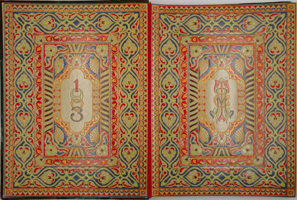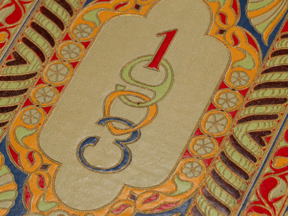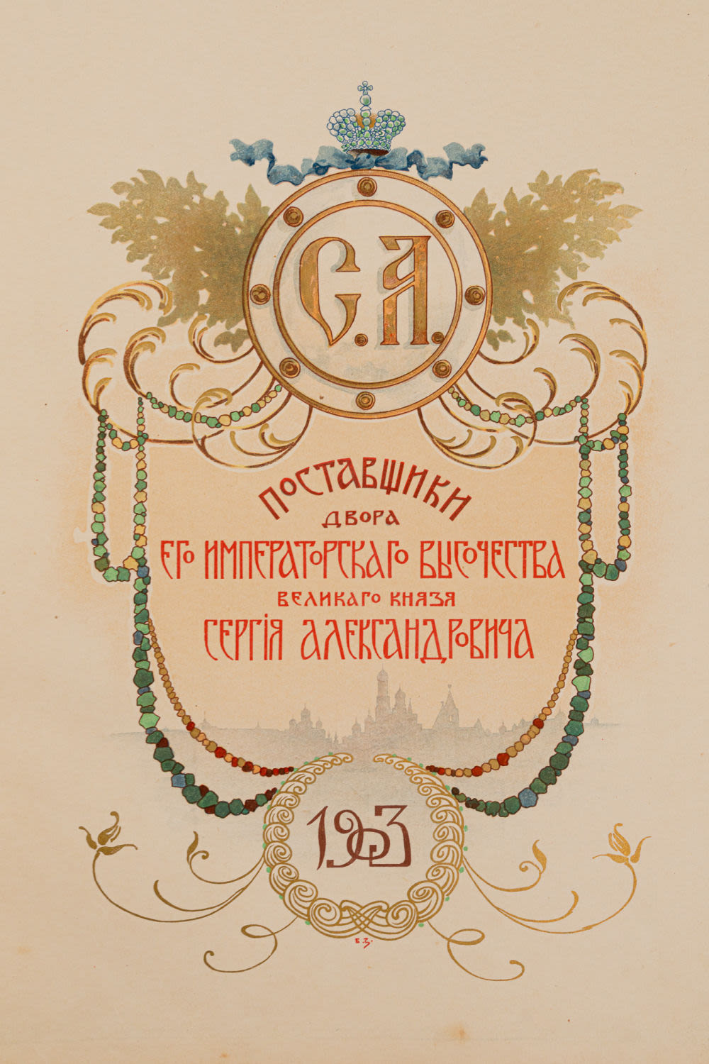 Переплёт – издательский иллюстрированный составной переплёт; крышки – картон, фактурная бумага с художественным полихромным тиснением: на верхней крышке типографская марка, на нижней – медали, полученные фирмой; корешок и уголки – кожа, трёхсторонний золотой обрез, орнаментированные форзацы, имитирующие перегородчатую эмаль, узорные художественные кальки.