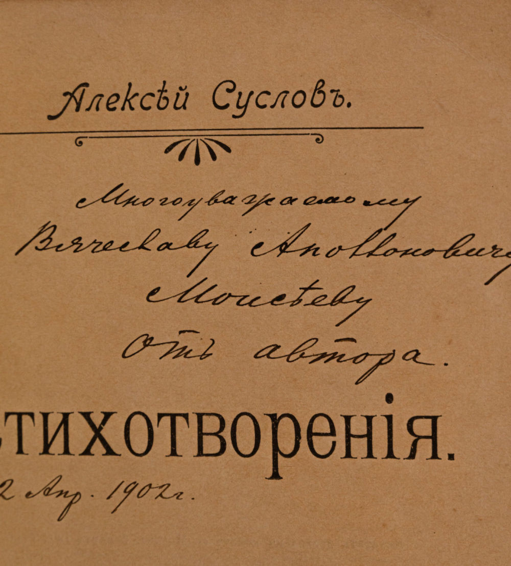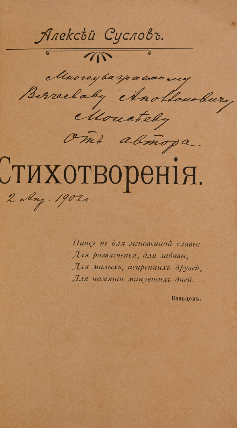 Дарственная надпись автора на тит. л.: “Многоуважаемому Вячеславу Аполлоновичу Моисееву от автора. 2 апр. 1902”.