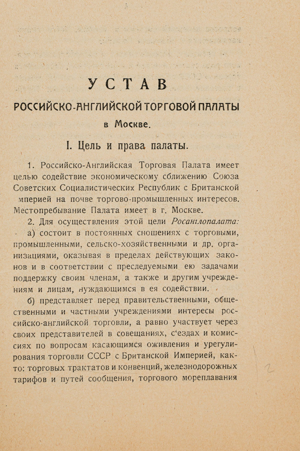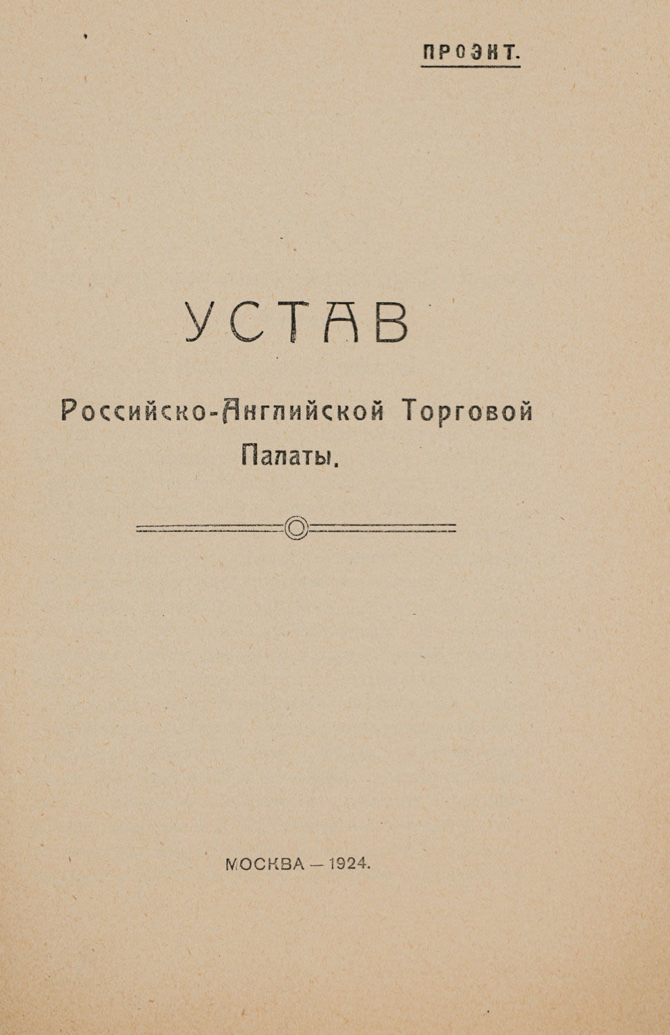 Российско-английская торговая палата. Москва. Устав Российско-английской торговой палаты: проект. М.: Тип. Голос труда, 1924. — 15 с.; 21х14,5 см.