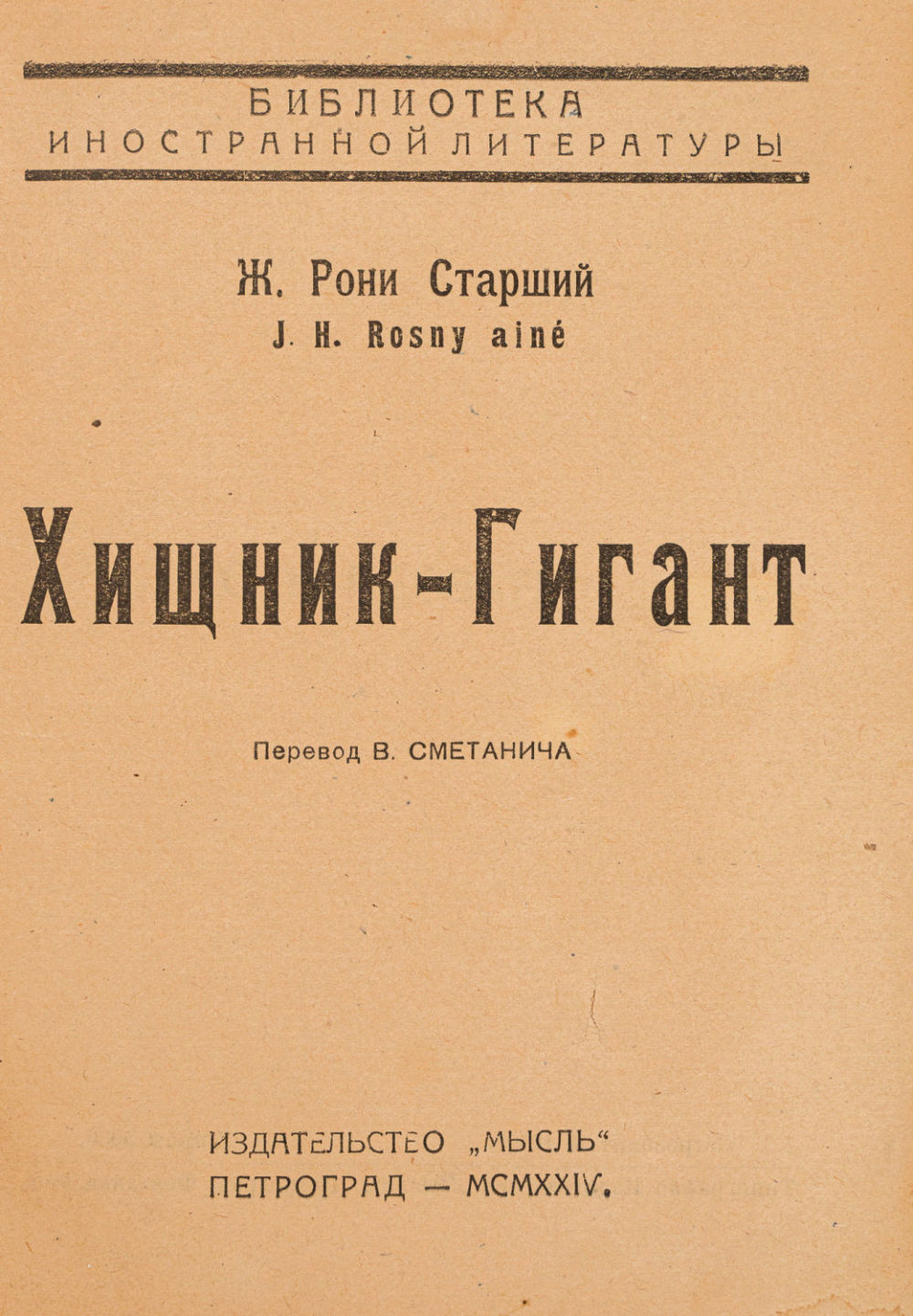 J.H. Rosny Ainé; пер. В.Сметанича. Пг.: Мысль, 1924. – 174, [2] с.; 18х14 см. — (Б-ка иностр. лит-ры).