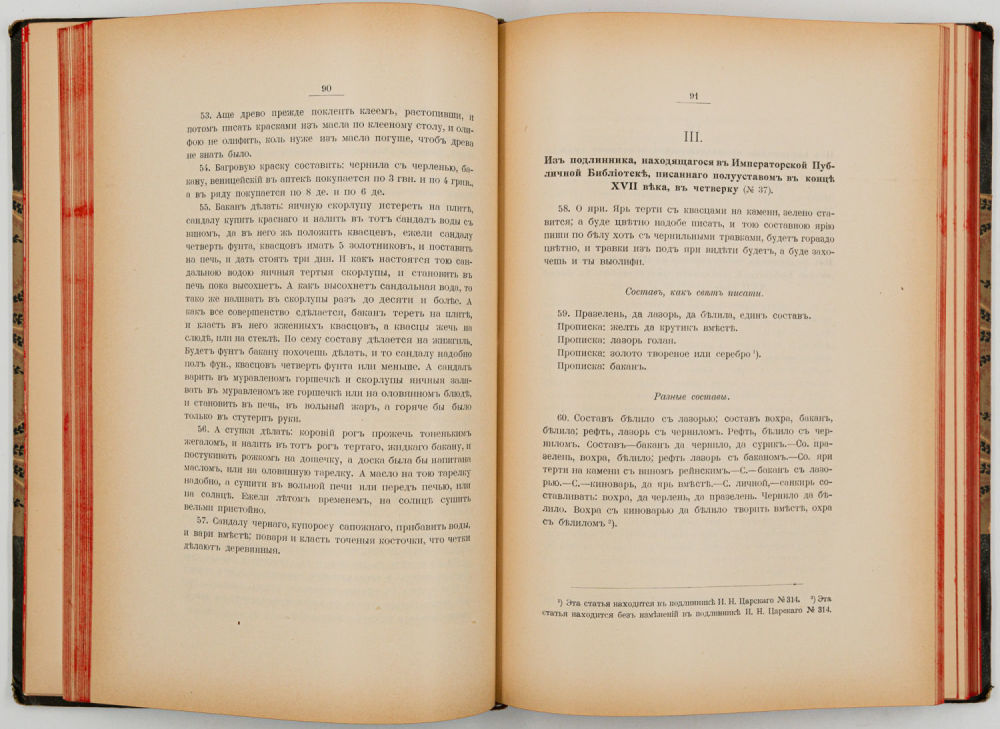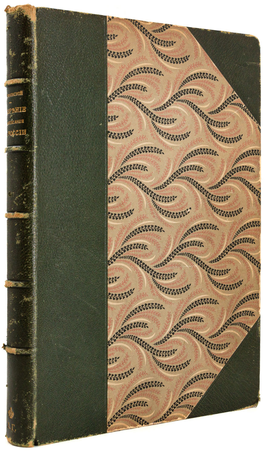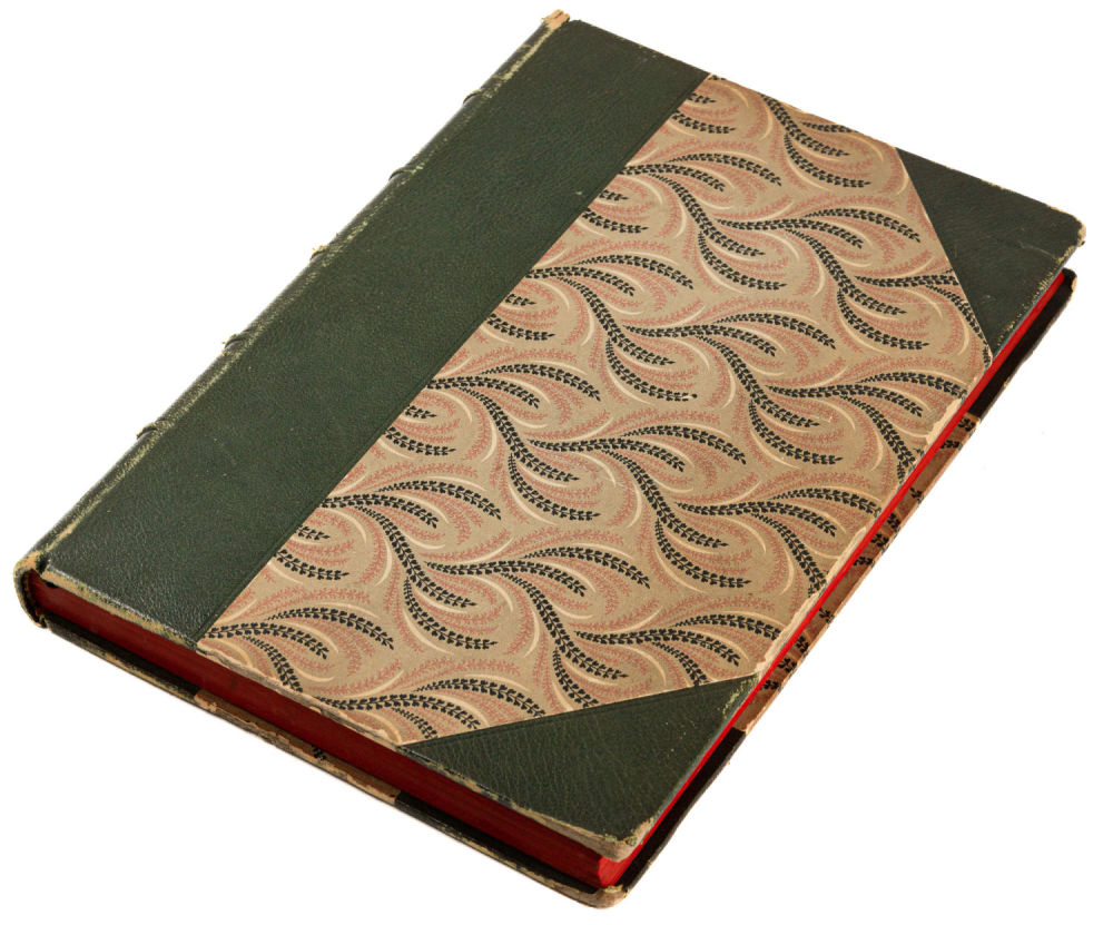 Переплет – владельческий, составной, крышки – картон, бумага с растительным орнаментом, корешок и уголки – кожа, корешок поделен бинтами на шесть сегментов, обрезы – тонированные, форзацы из «мраморной» бумаги.