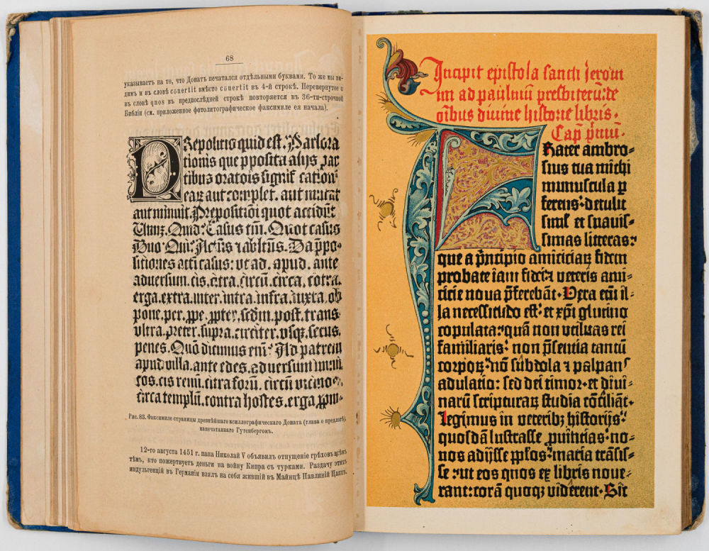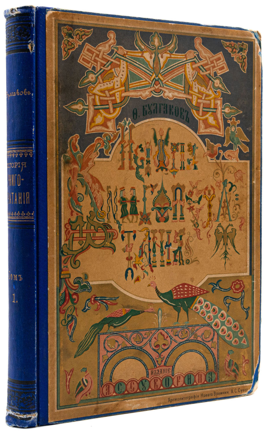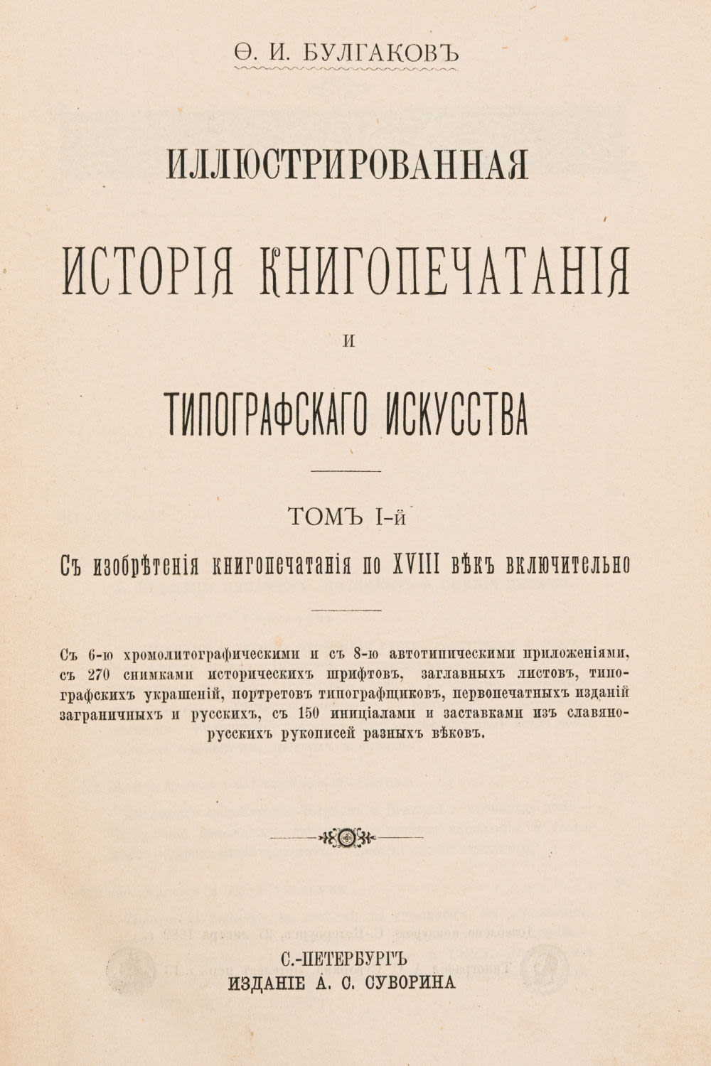 Т. I: С 6 хромолитографическими и с 8 автотипическими приложениями, с 270 снимками исторических шрифтов, заглавных листов, типографских украшений, портретов типографщиков, первопечатных изданий заграничных и русских, с 150 инициалами и заставками из слав.-рус. рукописей разных веков. – [4], VIII, 365 с.: ил., [14] л. ил.; 24х15 см.