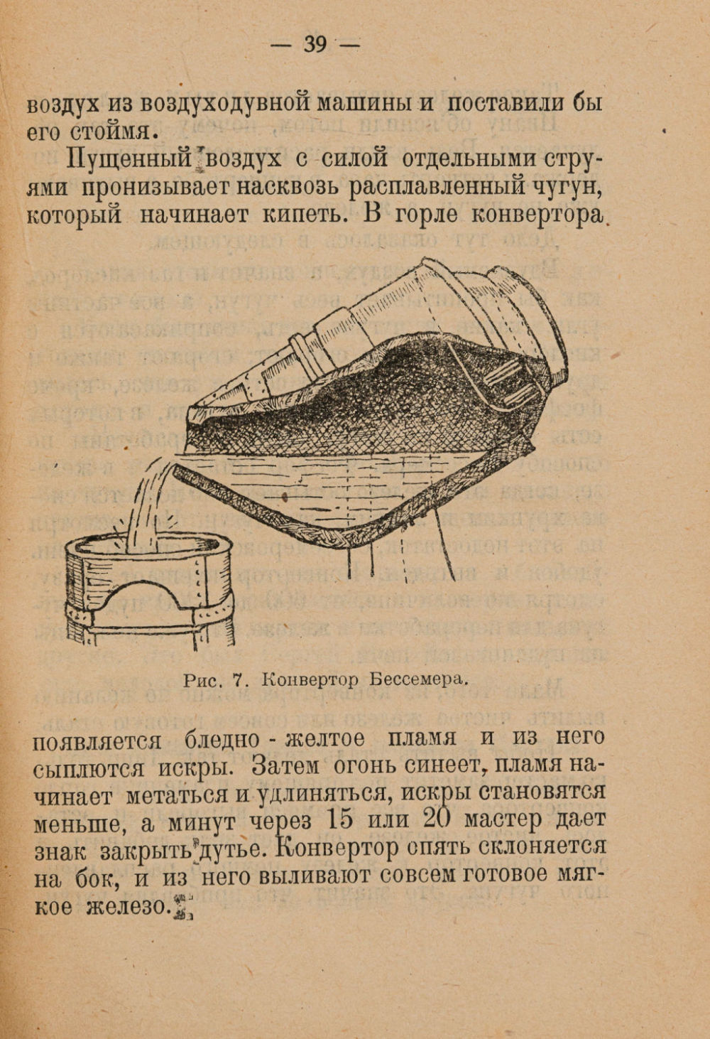 В стиле художественного повествования, автор излагает сведения о способах выплавки чугуна и переработки его в железо и сталь.
