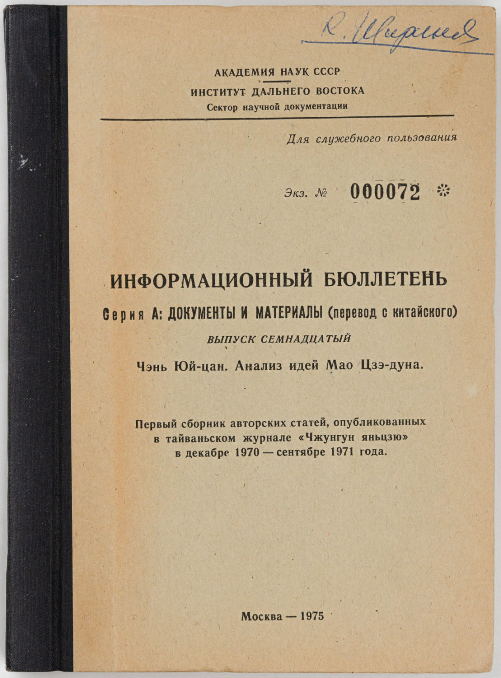 Институт дальнего Востока. Сектор научной документации. Перевод с китайского. М.: Б. и., 1975. – 232 с.; 20,5х15 см.