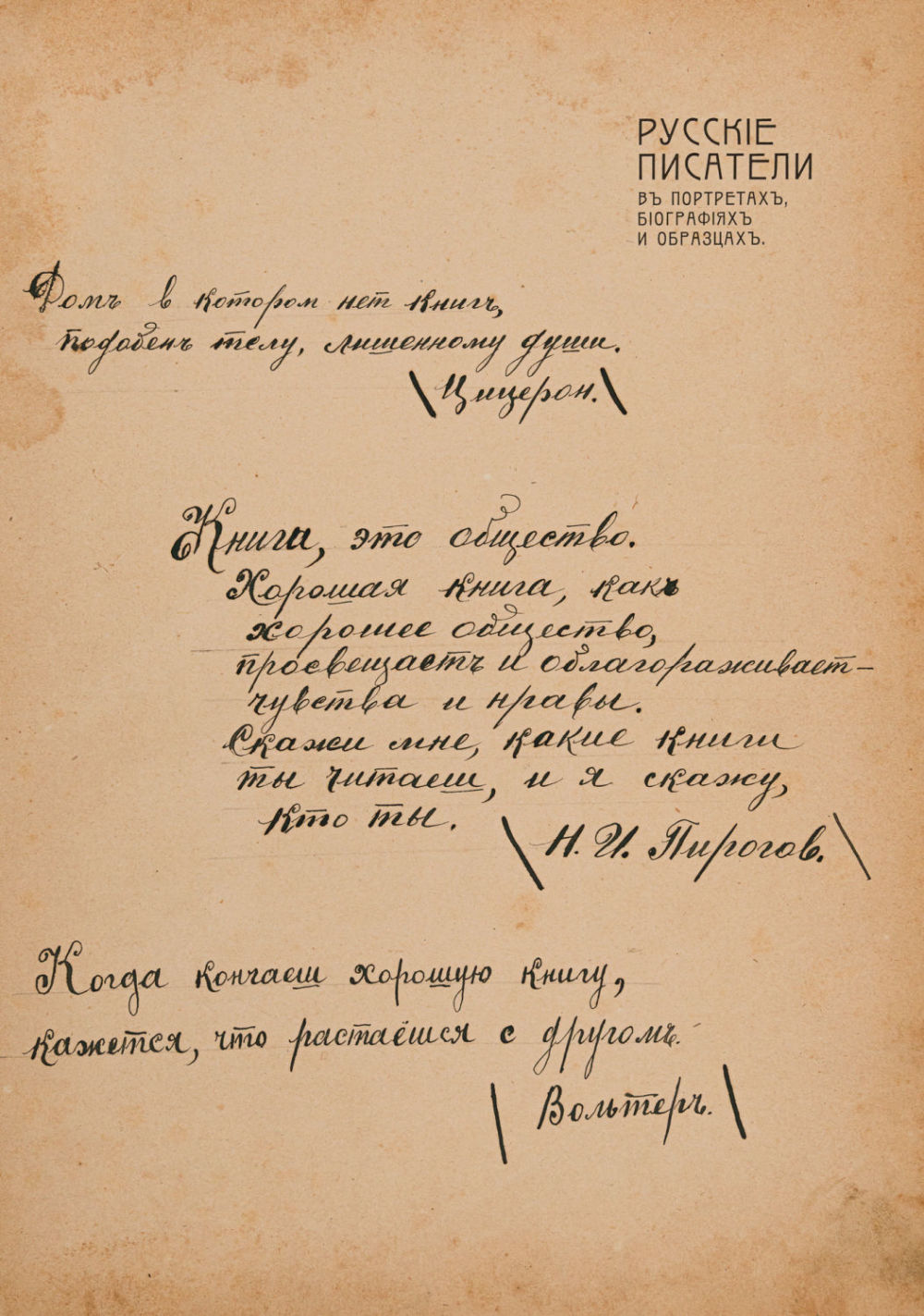 На авантитуле дореволюционные записи черными чернилами – цитаты Цицерона, Н. И. Пирогова и Вольтера.
