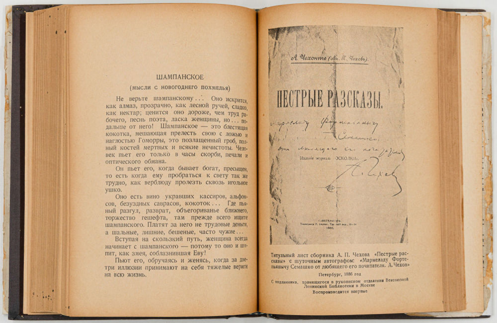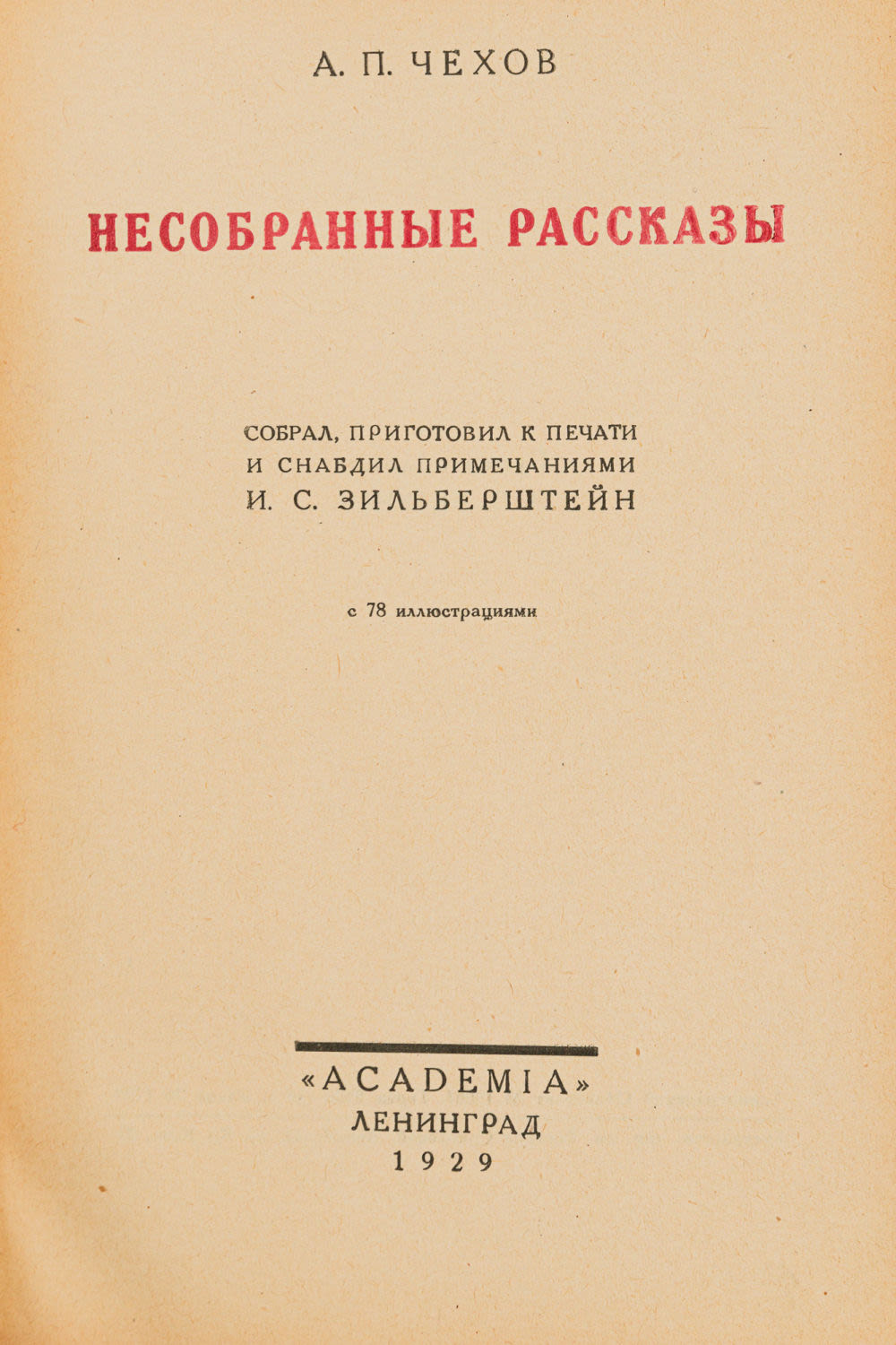 1. Чехов А.П. Несобранные рассказы; Подгот. к печати, предисл., примеч. И.С. Зильберштейна. Л.: Academia, 1929. — [1], XXXVI, 506 с.: ил., [1] л. портр.; 17,5×12,5 см. – (Памятники литературного творчества XIX и XX вв.).