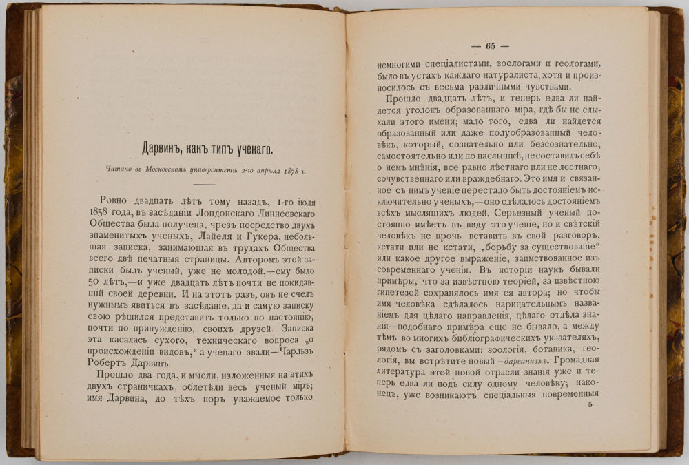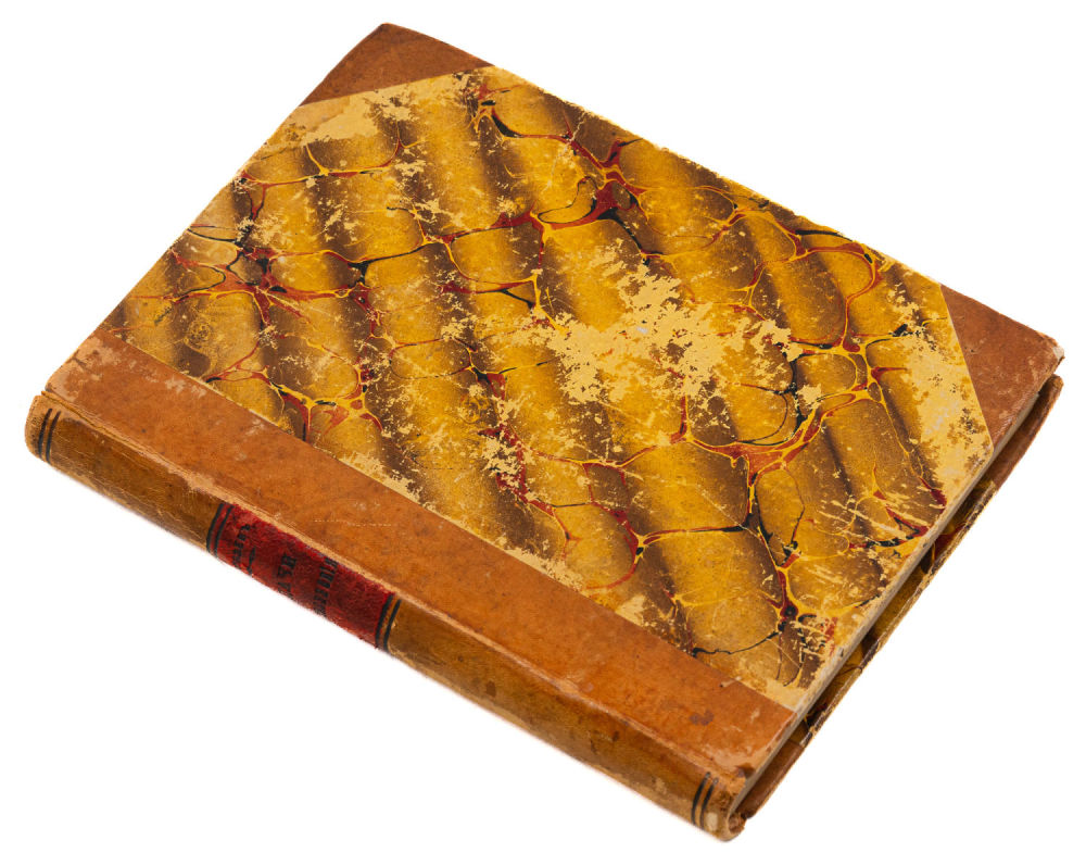 Переплет – владельческий, составной; крышки – картон, «мраморная» бумага, корешок и уголки – кожа, крапчатые обрезы.