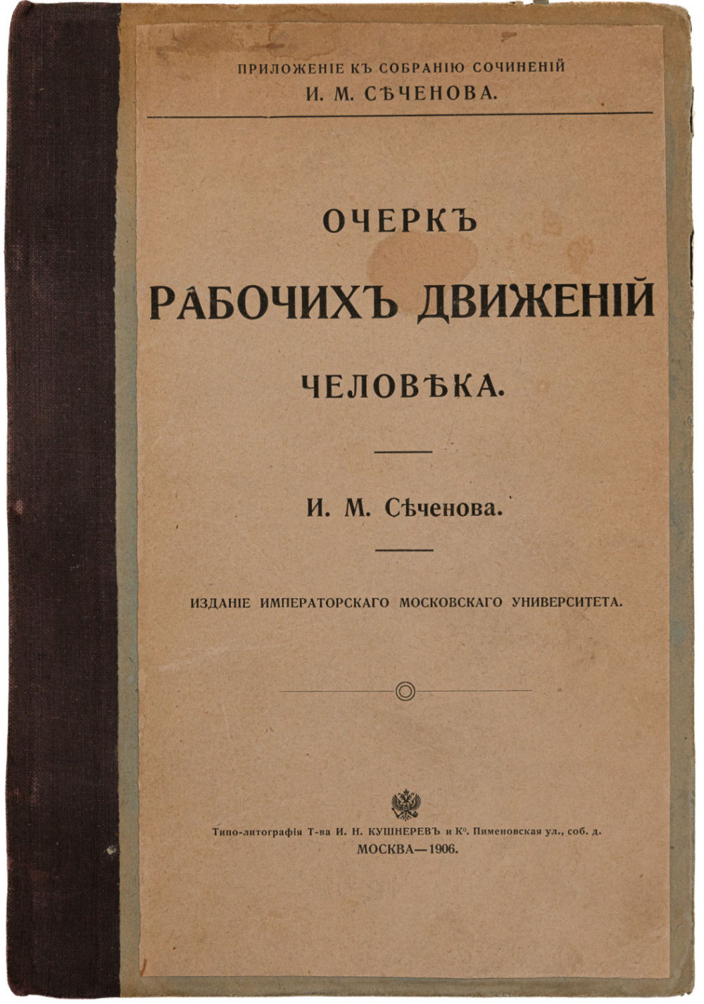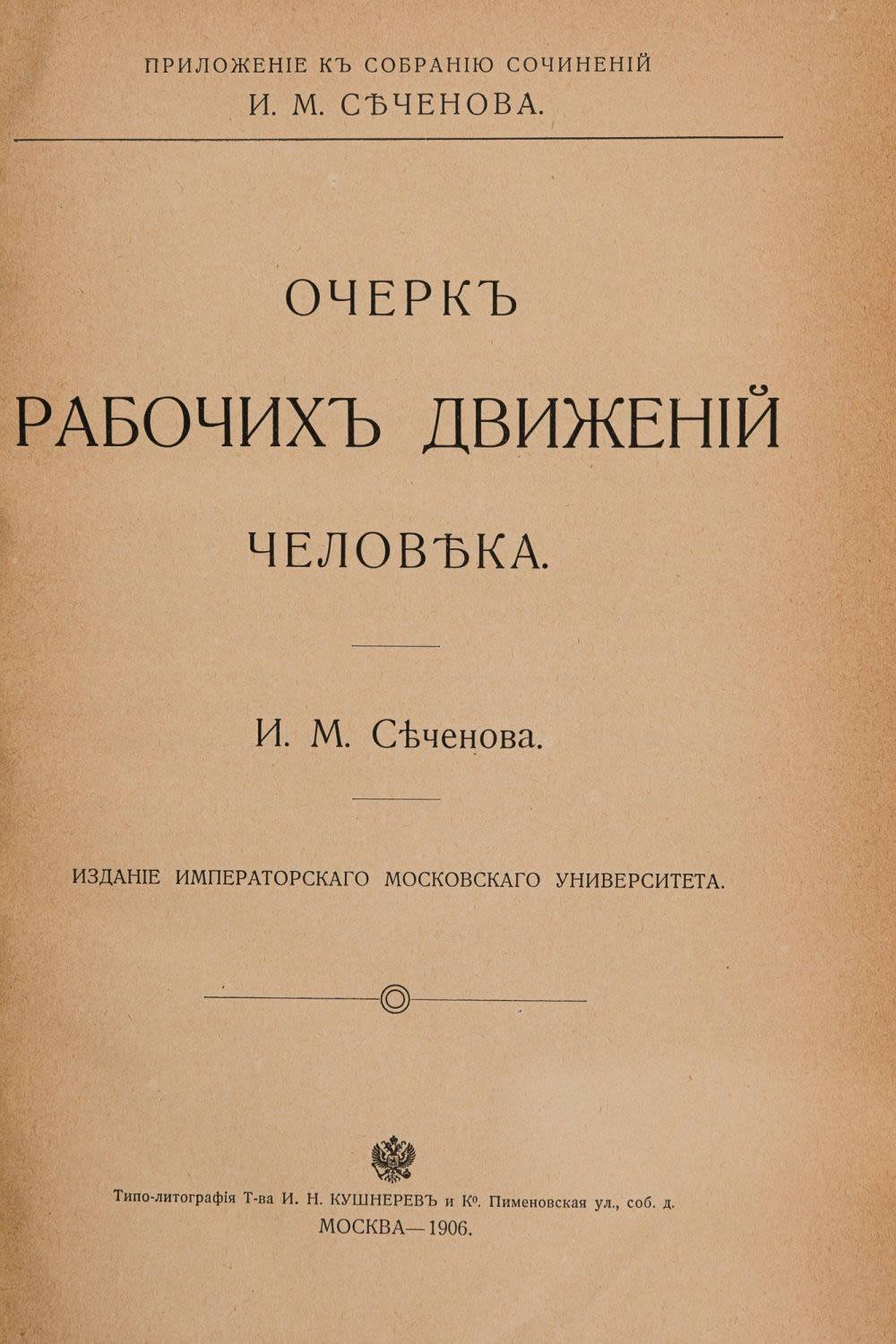 1) Сеченов И.М. Очерк рабочих движений человека. М.: Изд. Имп. Московского ун-та; типо-лит. И.Н. Кушнерева, 1906. – IV, 139 с.; 23,2х16 см.