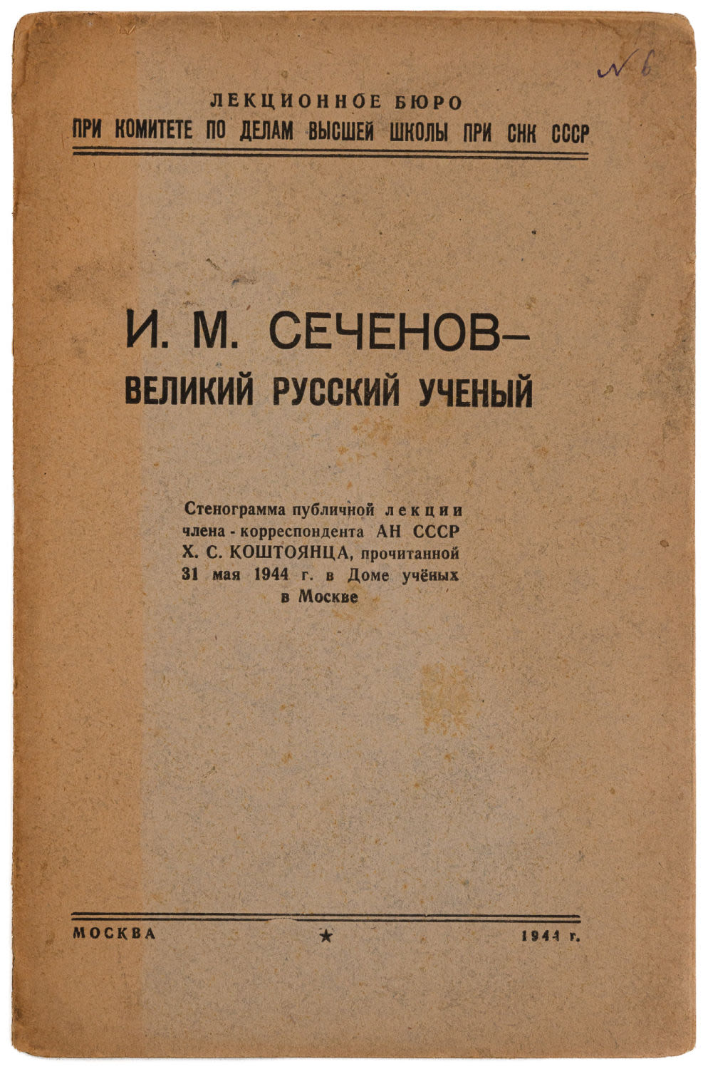 2) Коштоянц Х.С. И.М. Сеченов – великий русский ученый: М.: тип. газеты «Правда», 1944. — 23 с.; 21,7х14,3 см.