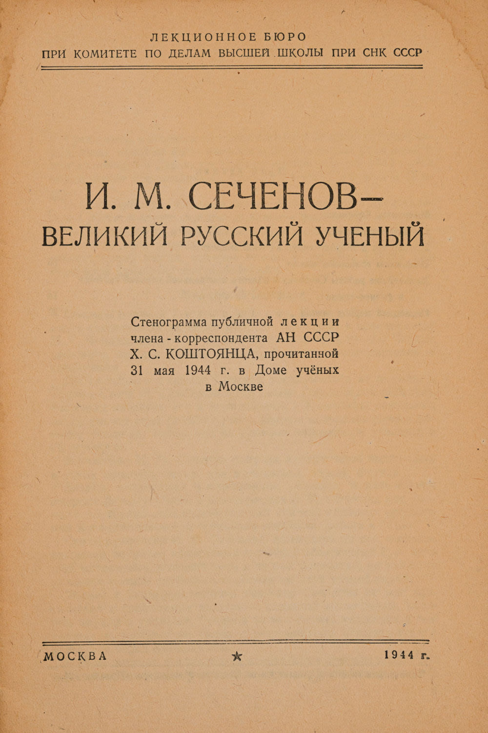 Стенография публичной лекции чл.-кор. АН СССР Х.С. Коштоянца, прочит. 31-го мая 1944 г. в Доме ученых в Москве.