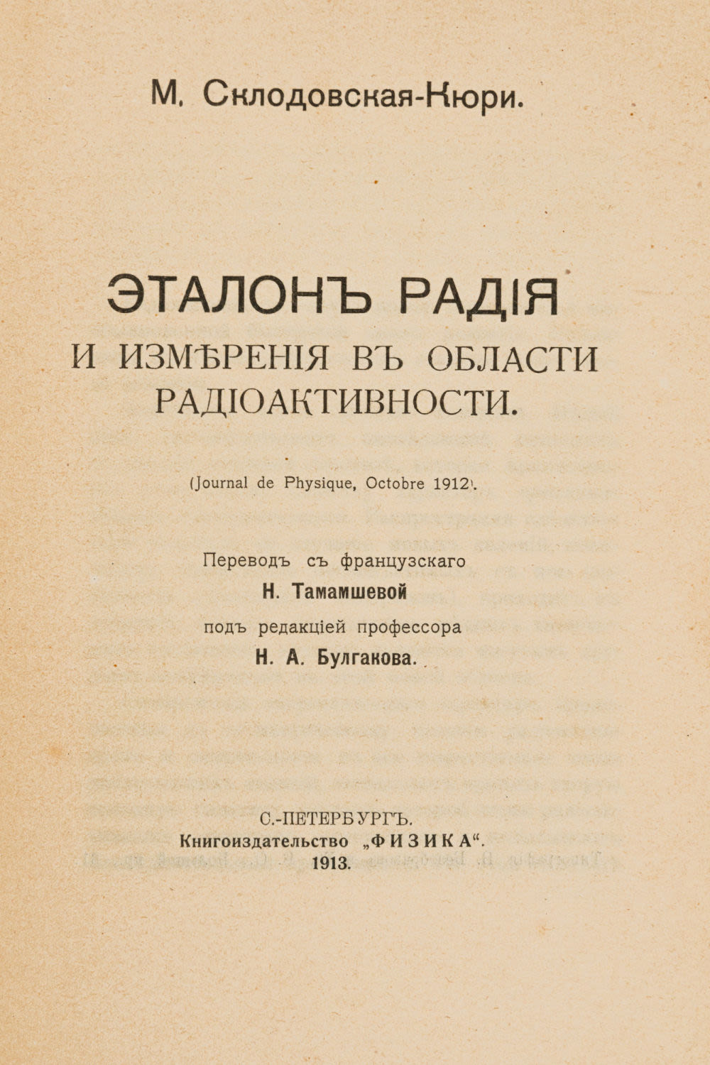 Первое издание на русском языке знаменитой работы из «Journal de Physique» за октябрь 1912 года, рассказывающей о получении эталона радия.