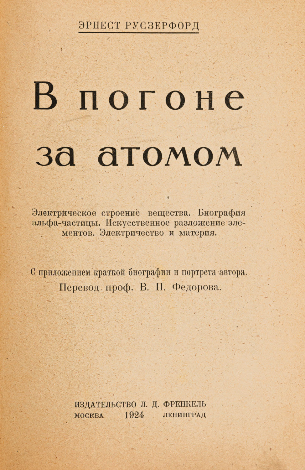 Электрическое строение вещества. Биография альфа-частицы. Искусственное разложение элементов. Электричество и материя / Эрнест Русзерфорд; пер. проф. В.П.Федорова. М.; Л.: Л.Д.Френкель, 1924. – 120, [8] с.: ил., 1 л. фронт. (портр.); 20х13,6 см.