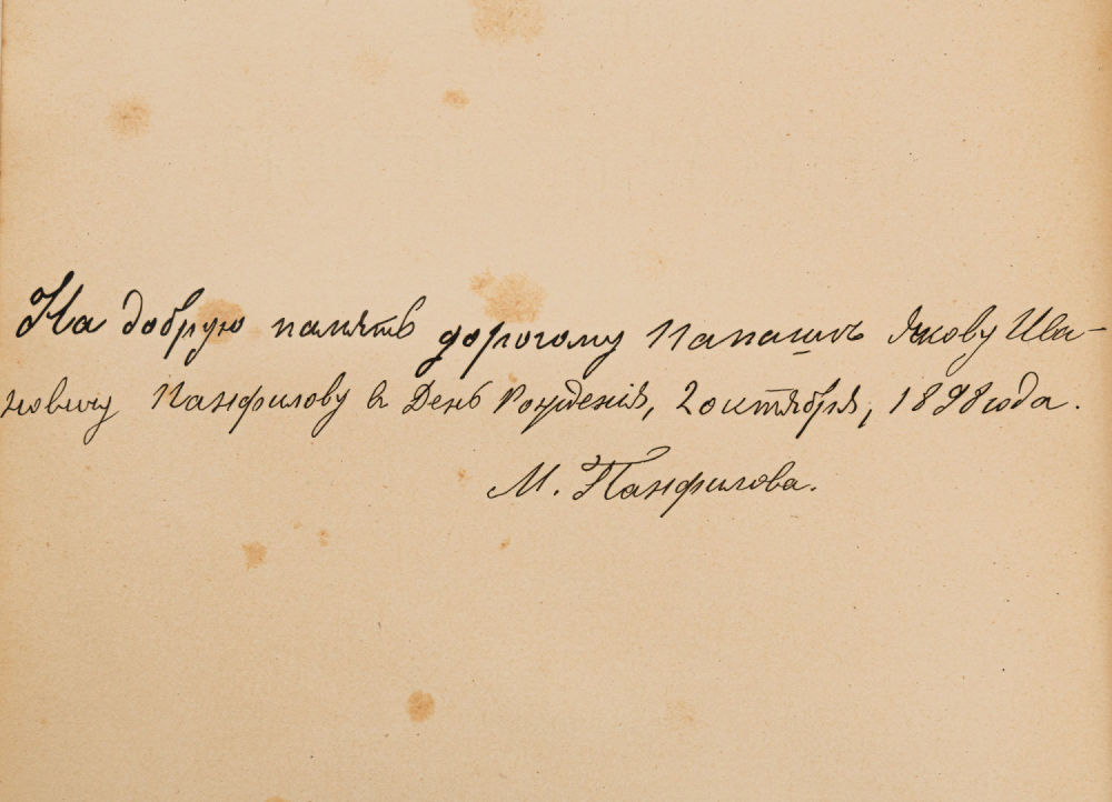 Дарственная надпись на обороте титульного листа (Т. 1): «На добрую память дорогому нашему Якову Ивановичу Панфилову в День Рождения, 2 октября, 1898 года. / М. Панфилова».