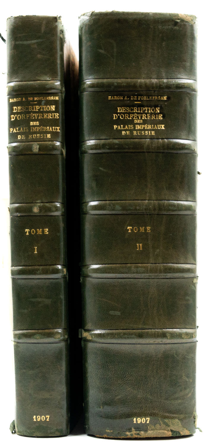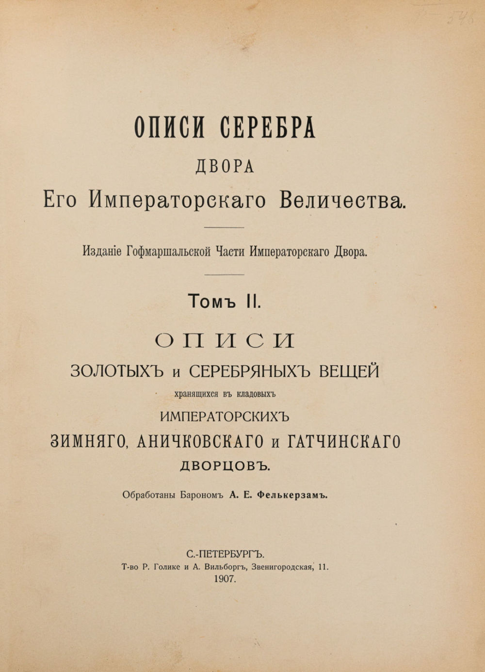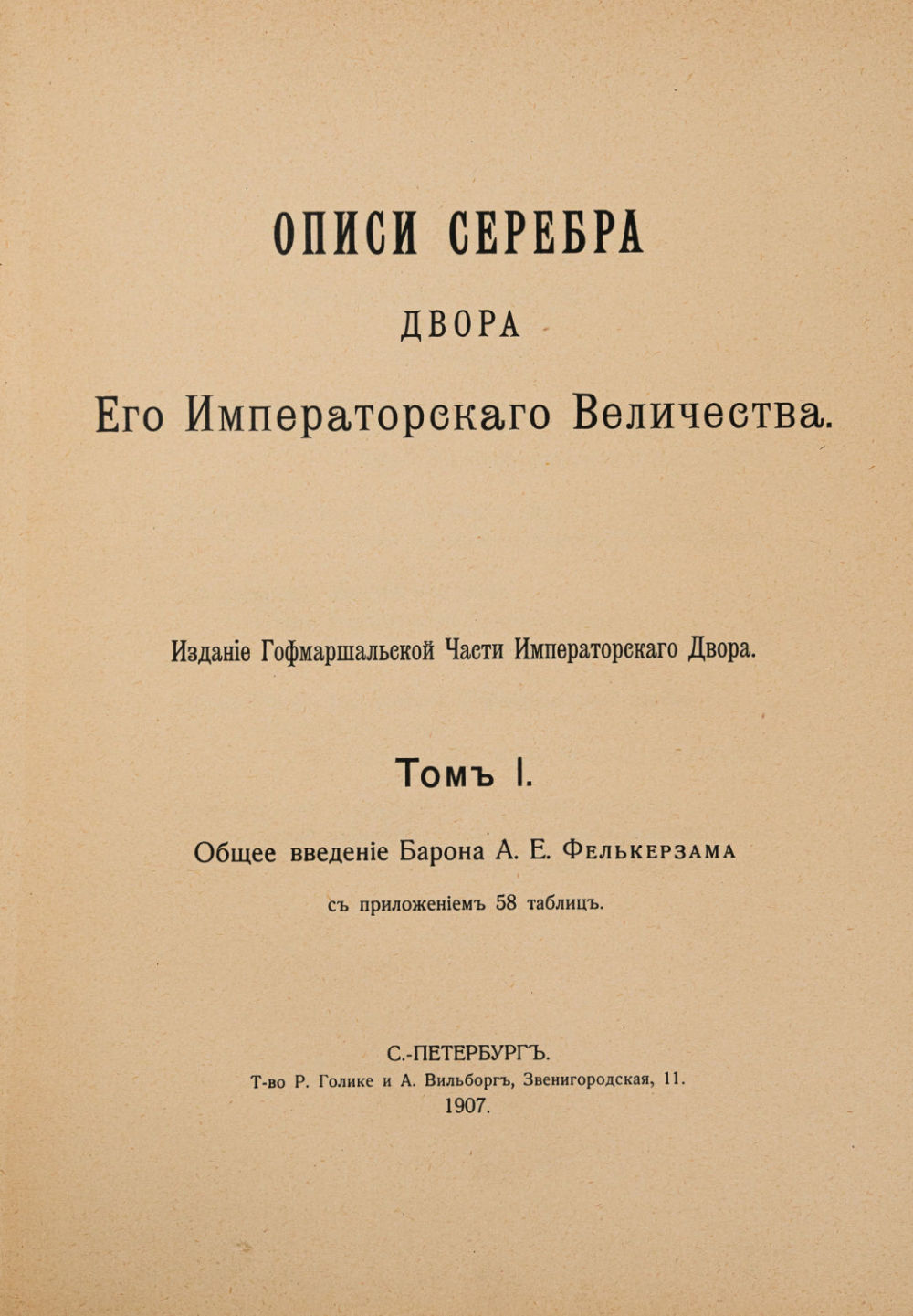 Редкое издание увеличенного формата с таблицами фототипий, в котором описаны замечательные образцы серебряных и золотых изделий из императорской коллекции Зимнего, Аничкова и Гатчинского дворцов. Вводная статья на французском языке. Предметы для императорской коллекции поступали от лучших ювелиров Франции, Англии, Германии, Италии, Швеции, Дании, Нидерландов, Австрии. Кроме изделий Санкт-Петербурга и Москвы, в кладовых Дворцов хранились изделия мастеров губернских городов: Пскова, Иркутска, Костромы, Вологды, Нарвы, Выборга и Риги. В издании воспроизведены их клейма.