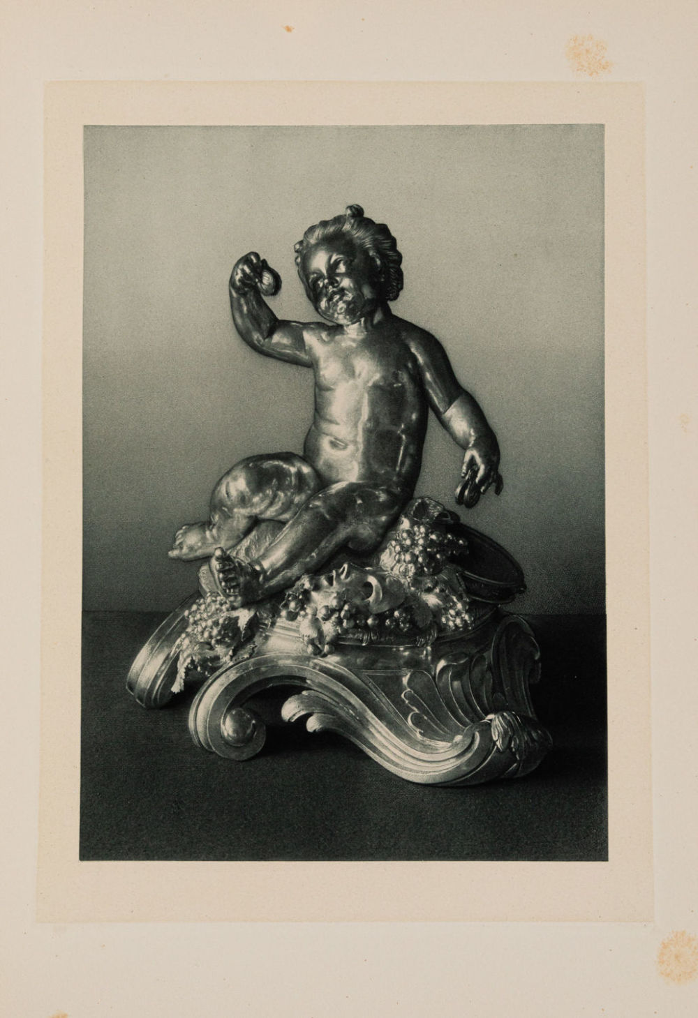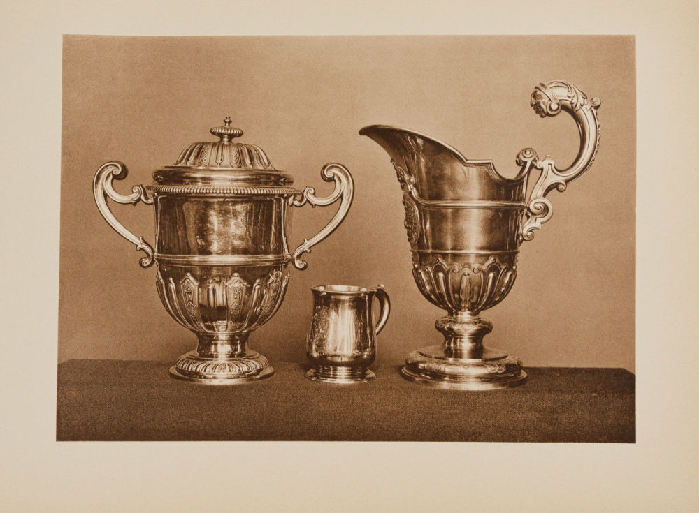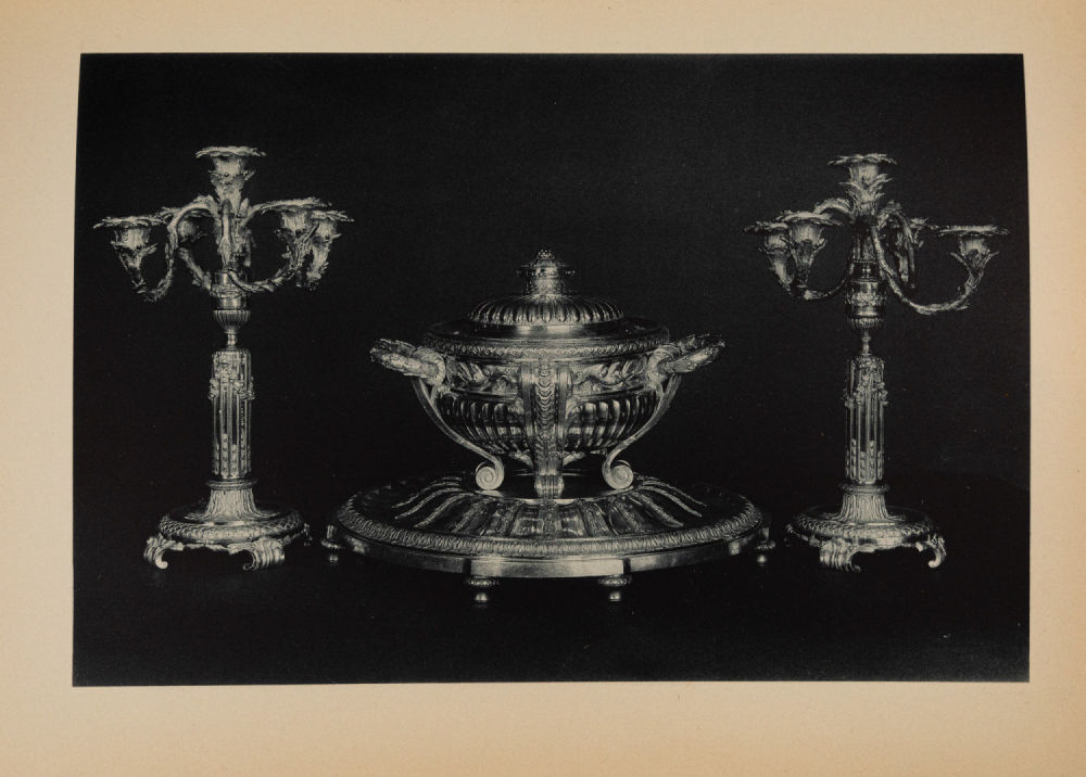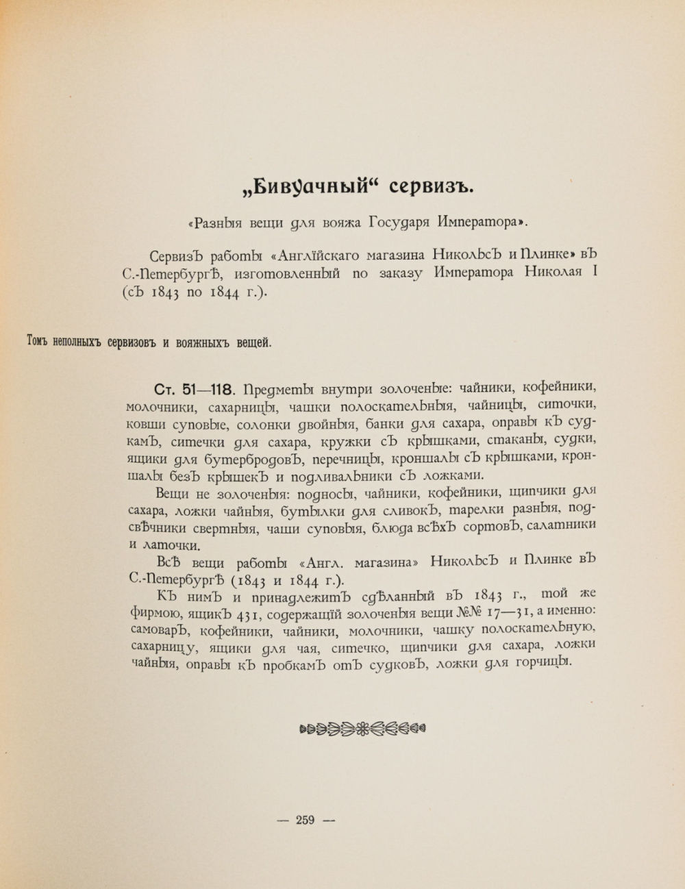 Редкое издание увеличенного формата с таблицами фототипий, в котором описаны замечательные образцы серебряных и золотых изделий из императорской коллекции Зимнего, Аничкова и Гатчинского дворцов. Вводная статья на французском языке. Предметы для императорской коллекции поступали от лучших ювелиров Франции, Англии, Германии, Италии, Швеции, Дании, Нидерландов, Австрии. Кроме изделий Санкт-Петербурга и Москвы, в кладовых Дворцов хранились изделия мастеров губернских городов: Пскова, Иркутска, Костромы, Вологды, Нарвы, Выборга и Риги. В издании воспроизведены их клейма.