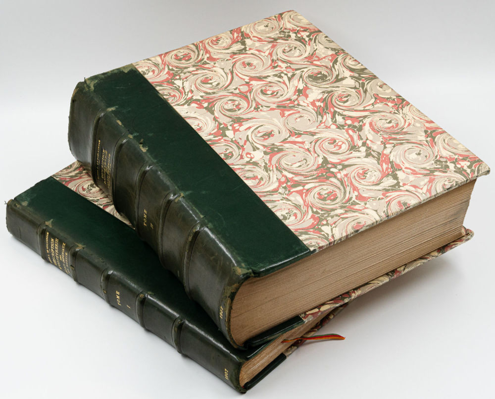 Переплёты — владельческие, составные; крышки — картон, “мраморная” бумага, корешки на пять бинтов — кожа.