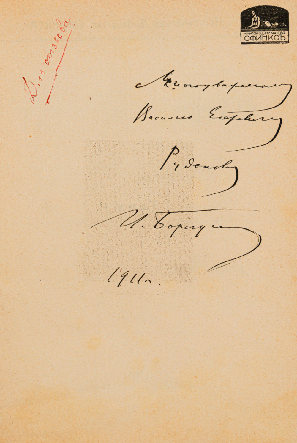 Дарственная надпись автора вступительной статьи И.Н. Бороздина писателю и переводчику Рудакову (1864-1913) на авантитуле: «Для отзыва / Многоуважаемому Василию Егоровичу Рудакову. И. Бороздин. 1911».