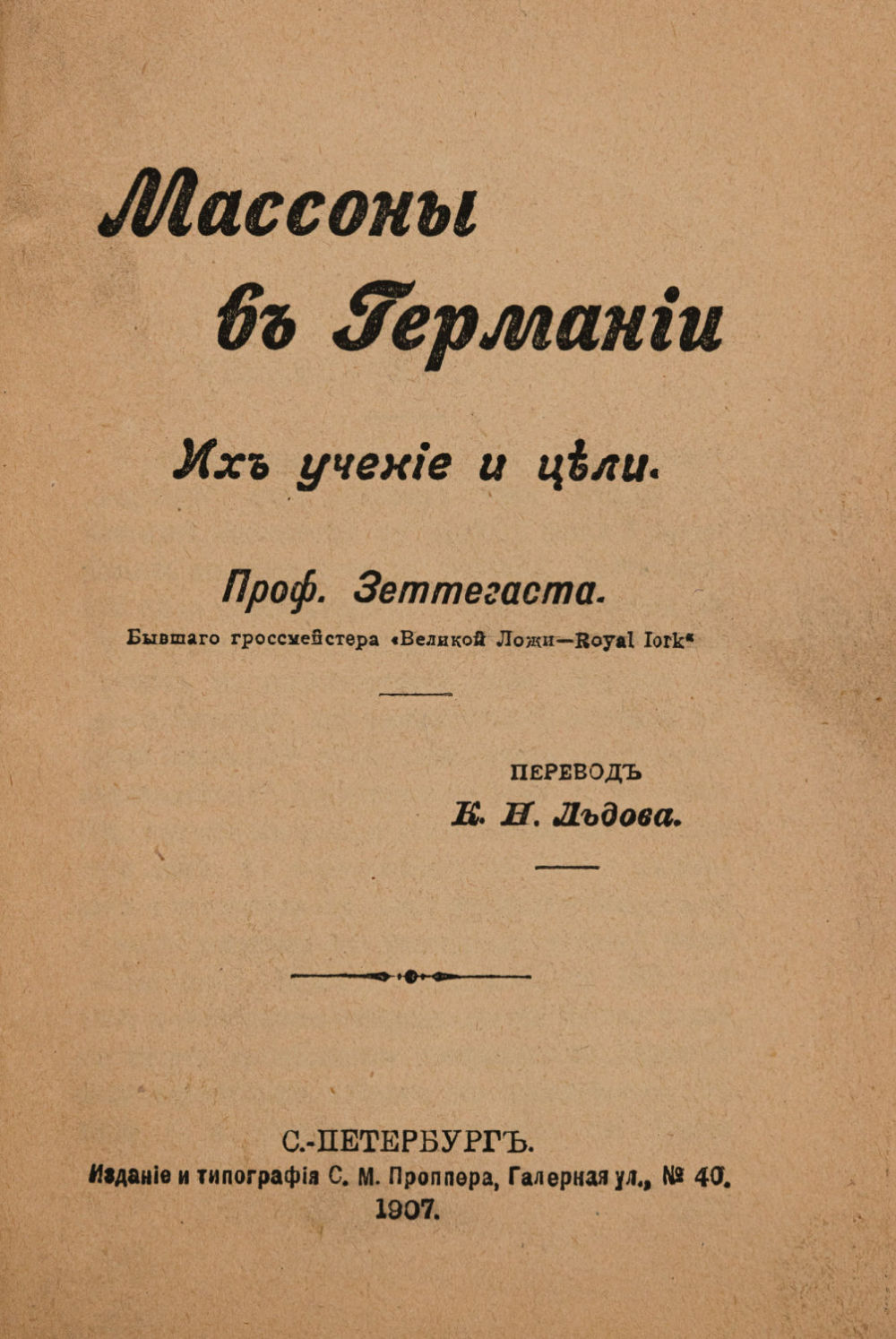 [Соч.] проф. Зеттегаста, б. гроссмейстера «Великой ложи — Royal lork»; пер. К.Н. Льдова [псевд.]. СПб.: изд. и тип. С.М. Проппера, 1907. — 64 с.; 15,5х10,5 см. — (Политическая, историческая и популярно-научная «Б-ка для саморазвития»; Вып. 81. Политическая б-ка; Вып. 21).