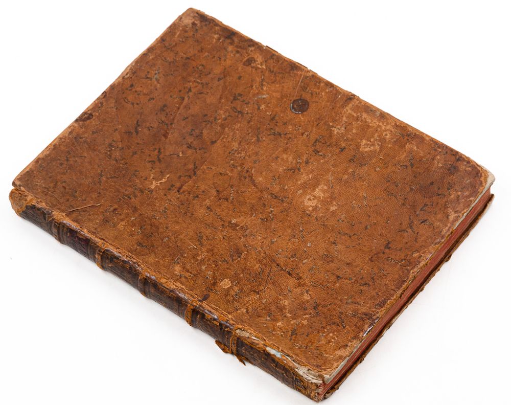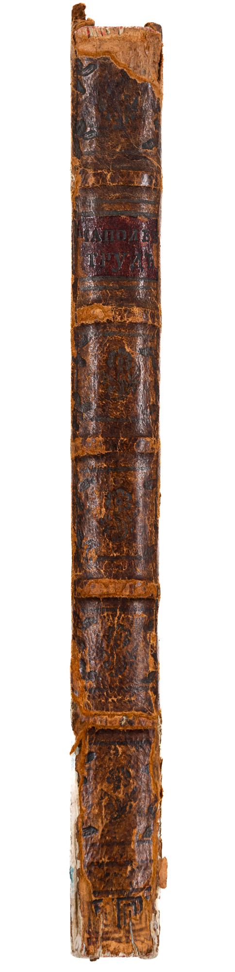 Сохранность – хорошая, потертости переплета, уголков и корешка, следы влаги на переплете, утрата фрагментов кожи переплета, уголков и корешка, трещина переплета нижней части корешка, надрыв тит. л. и утрата фрагмента нижнего поля без ущерба для текста, редкие фоксинги в блоке, пометы и шт. бук. маг. на обороте свободного листа нахзаца, след от наклейки на нахзаце.
