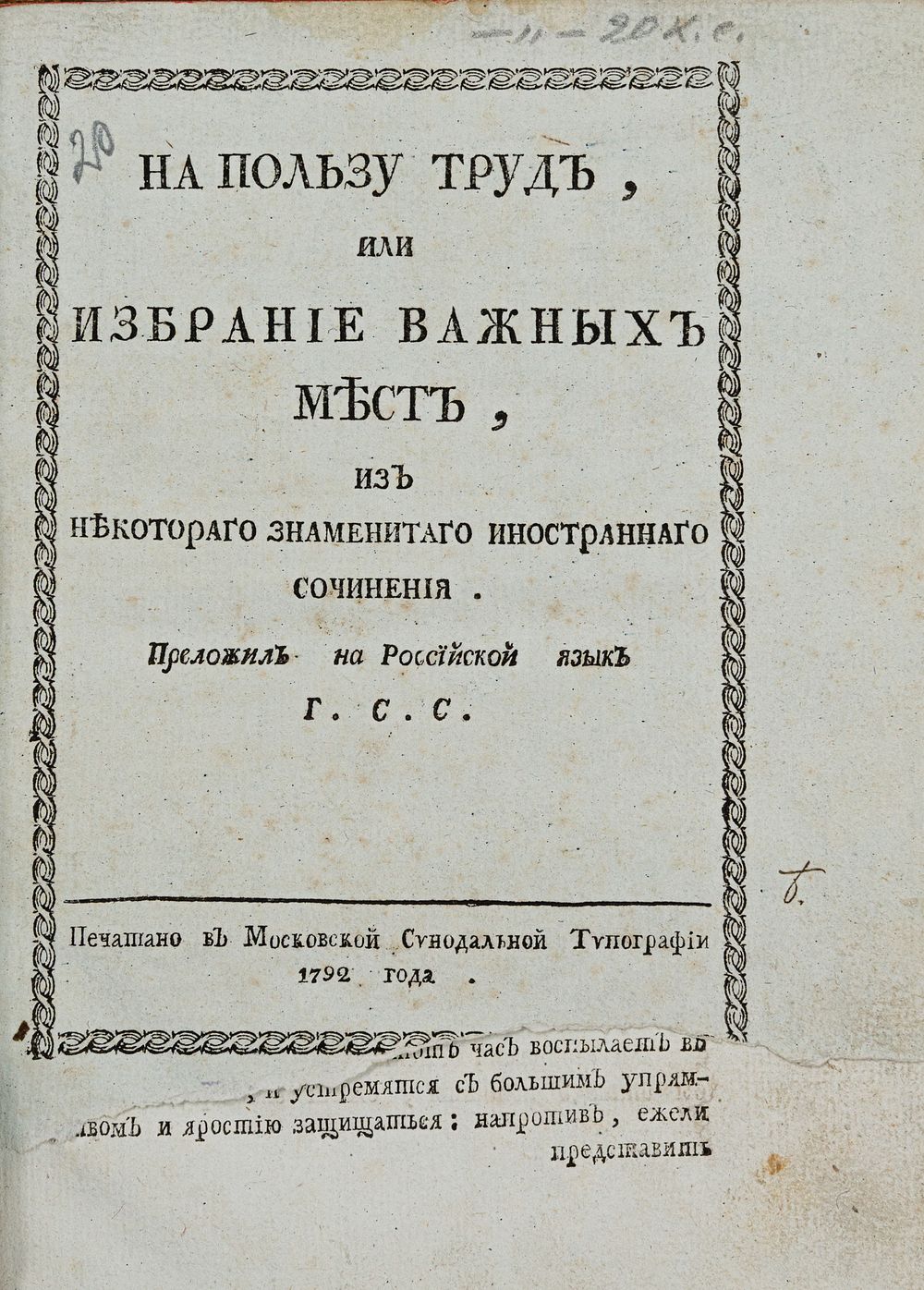 Преложил [с фр.] на российской язык Г[раф] С[ергей] С[алтыков]. [М.]: Моск. Синод. тип., 1792. — [4], 158 с.; 21,5х16 см.