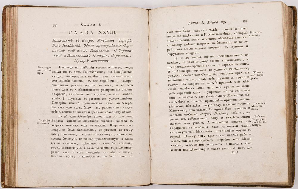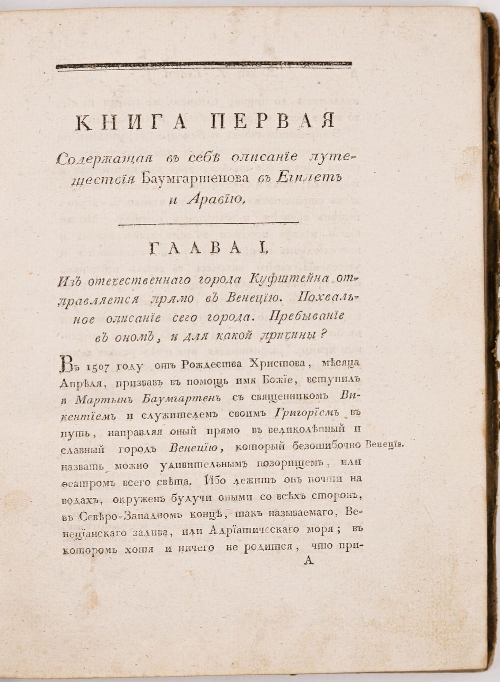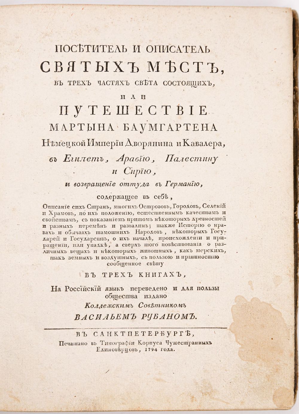 Или Путешествие Мартына Баумгартена, Немецкой империи дворянина и кавалера, в Египет, Аравию, Палестину и Сирию, и возвращение оттуда в Германию, содержащее в себе, описание сих стран, многих островов, городов, селений и храмов, по их положению, естественным качествам и свойствам: с показанием притом некоторых древностей и разных перемен и развалин; также историю о нравах и обычаях тамошних народов, некоторых государей и государств, о их начале, происхождении и приращении, или упадке, а сверх того повествования о различных вещах и некоторых животных, как морских, так земных и воздушных,: с пользой и приятностию сообщенное свету в трех книгах. На российский язык переведено и для пользы общества издано коллежским советником Васильем Рубаном. СПб.: Печатано в Тип. Корпуса чужестранных единоверцов, 1794. – X, 280, [2] с.; 24,5×19 см.