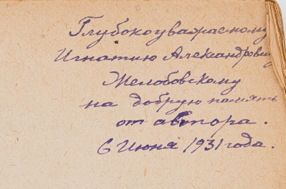 Автограф Игнатию Желобовскому на форзаце: «Глубокоуважаемому Игнатию Александровичу Желобовскому на добрую память от автора. 6 июня 1931 года».
