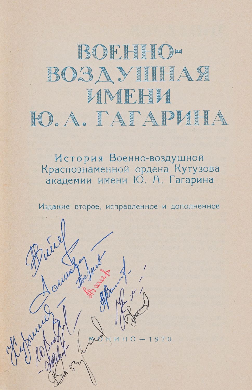 Военно-воздушная имени Ю. А. Гагарина. История Военно-воздушной Краснознаменной ордена Кутузова академии имени Ю. А. Гагарина. 2-е изд. Монино: Б. и., 1970. – 207 с., [18] л. ил.; 21,5х14,5 см.